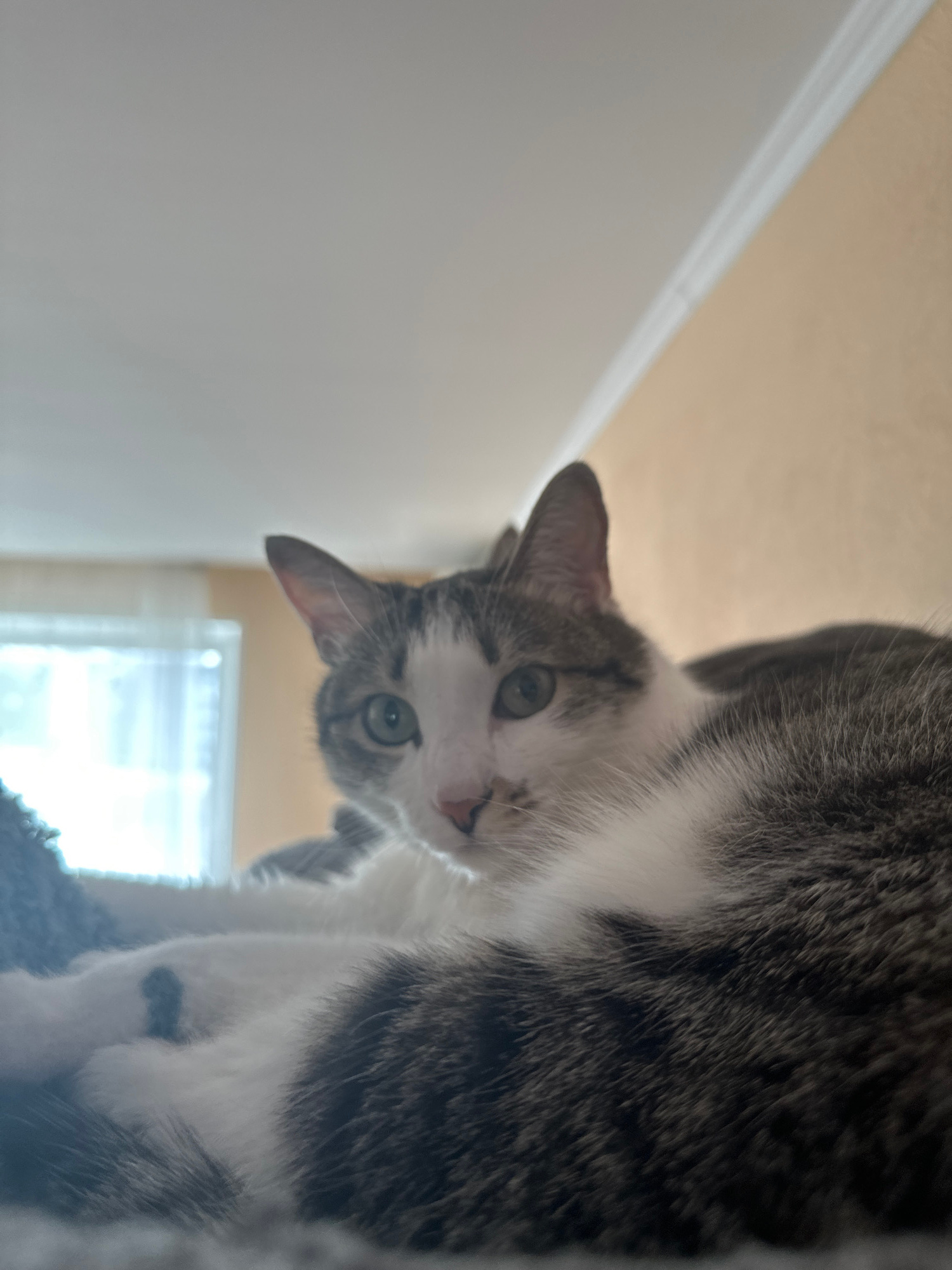 A cat with gray and white fur is looking down at the camera. The cat is on a cat tree, and a wall is in the background. The location is inside a room, likely a domestic residence. There is no evidence…read more