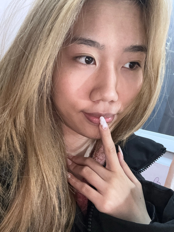 A close-up image depicts a young East Asian female, visible from approximately the chest up, in an indoor setting within Shapingba District, China. She has long, straight, blonde hair, dark eyes, and…read more