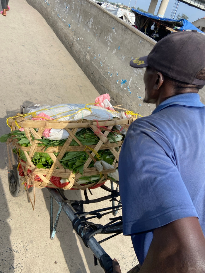 This image, taken from an elevated perspective, captures a man transporting goods on a bicycle in what appears to be an urban or semi-urban setting in Dar es-Salaam, Tanzania, during bright daylight.…read more
