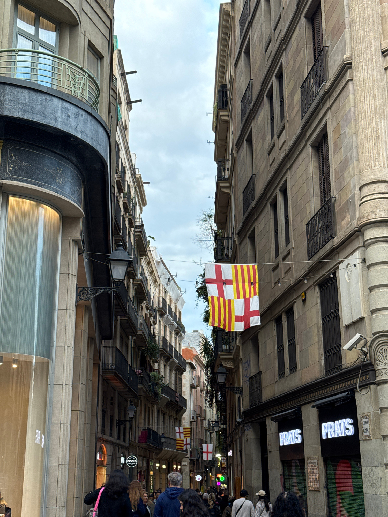 The image depicts a narrow street in Barcelona, Spain, lined with buildings. A flag, featuring a red cross on a white background and yellow and red stripes, is suspended above the street between build…read more