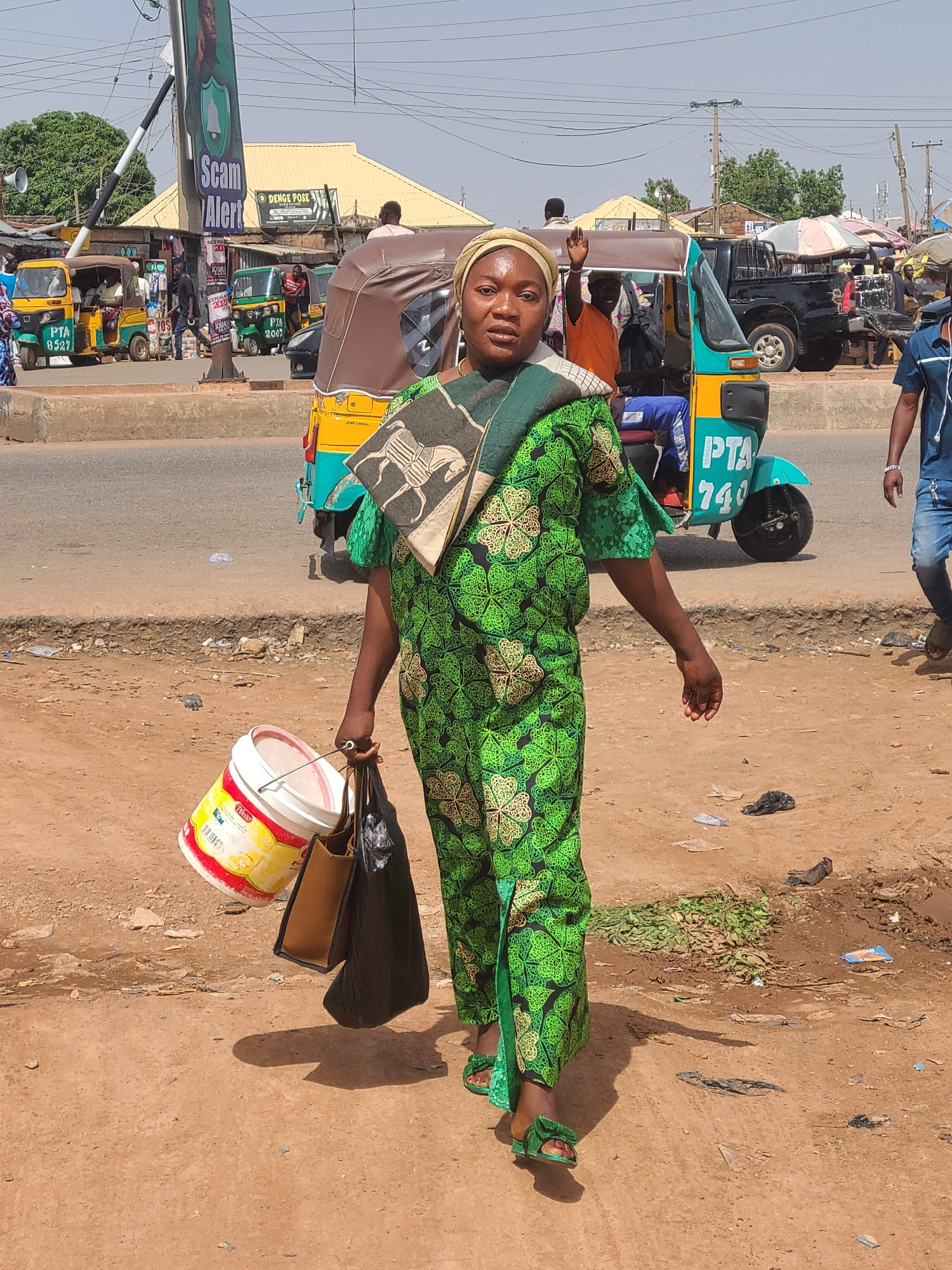 A woman stands on a dirt and asphalt surface near a street with several three-wheeled vehicles in the background. She wears a green patterned dress and a head covering, holding a bucket in one hand an…read more