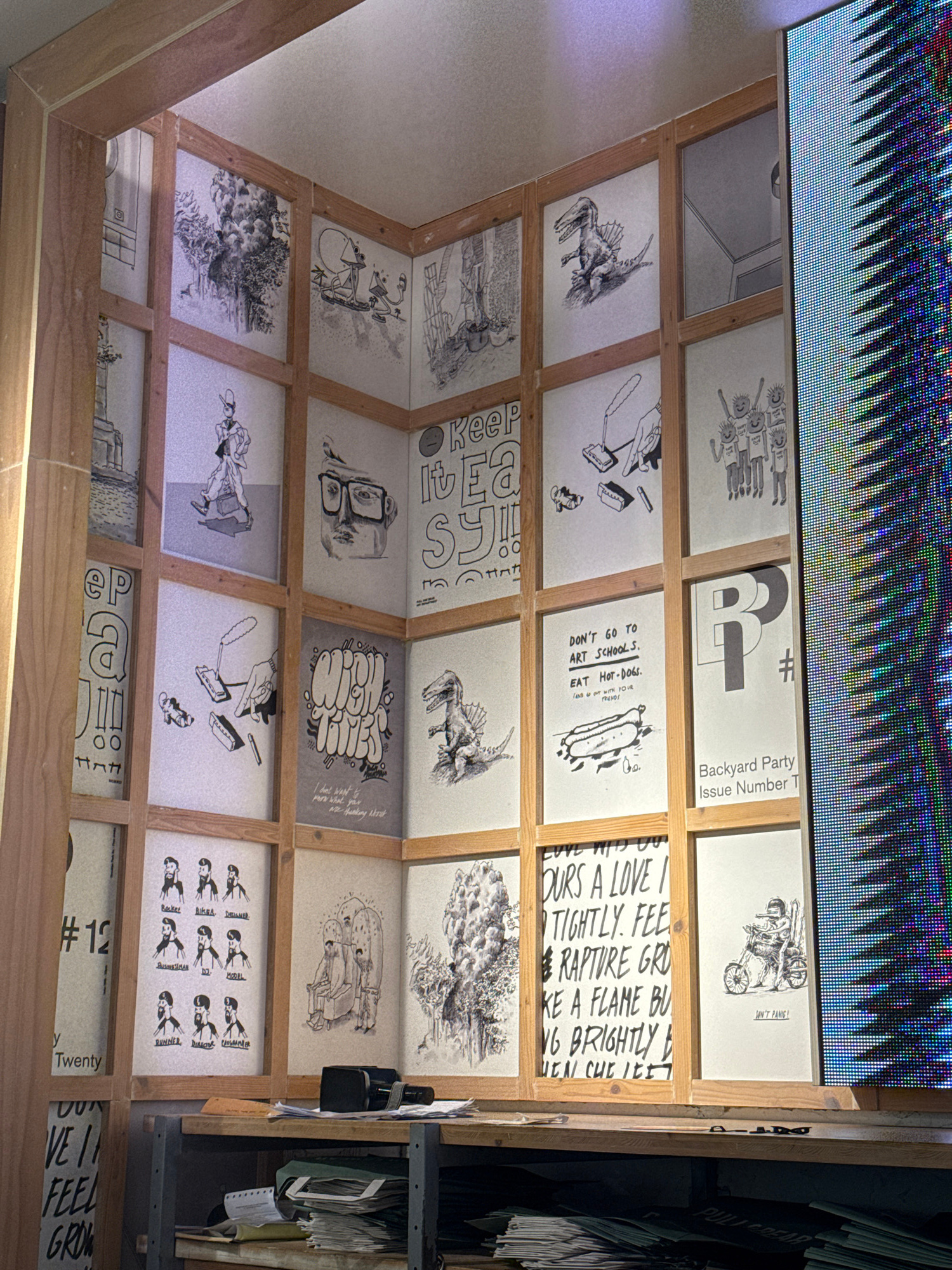 The image shows a display of various black and white drawings and text-based posters within a wooden frame structure. The posters feature a mix of illustrations, text art, and hand-drawn graphics. The…read more