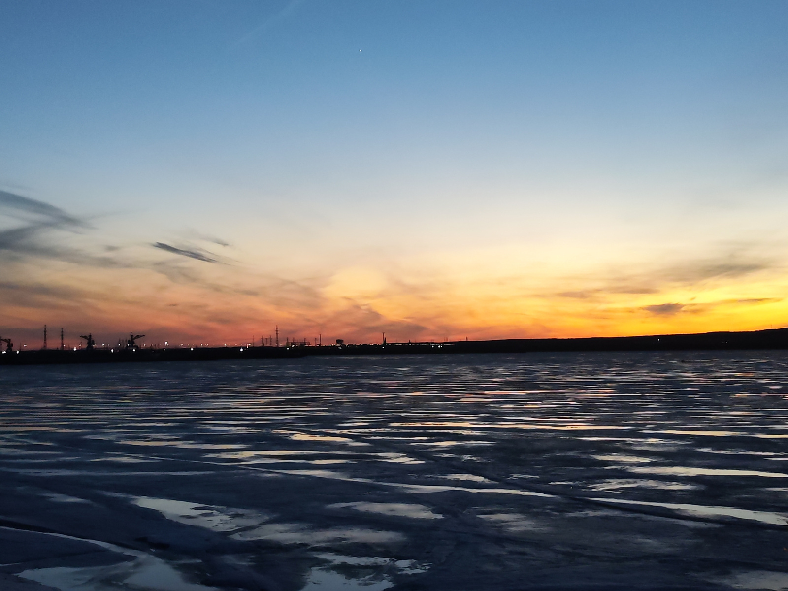 The image depicts a landscape at sunset over what appears to be a partially frozen body of water, possibly in or near Chaikovsky, Russia. The sky transitions from a deep blue at the top to shades of o…read more
