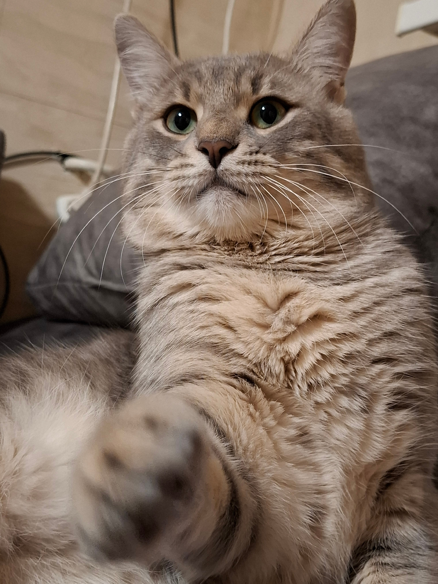 A close-up, slightly canted view features a silver tabby cat. The cat is positioned on what appears to be a grey fabric surface. Its green eyes are focused toward the viewer. The cat's right paw is pa…read more
