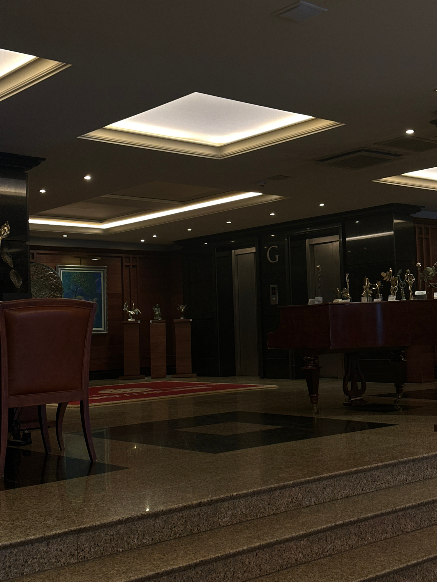 The image captures the interior of what appears to be an elegant and dimly lit lobby or hallway within a building, likely in Sofia, Bulgaria. The perspective is slightly elevated, looking down into th…read more