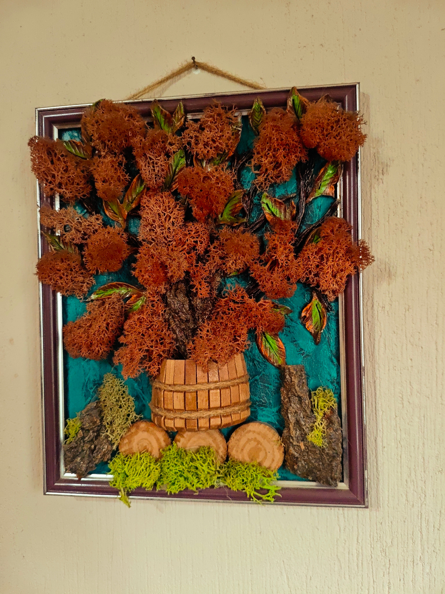 A framed wall-mounted floral arrangement hangs against a light beige, textured wall. The arrangement features a rustic, wooden barrel-shaped container filled with a brown, moss-like material forming a…read more