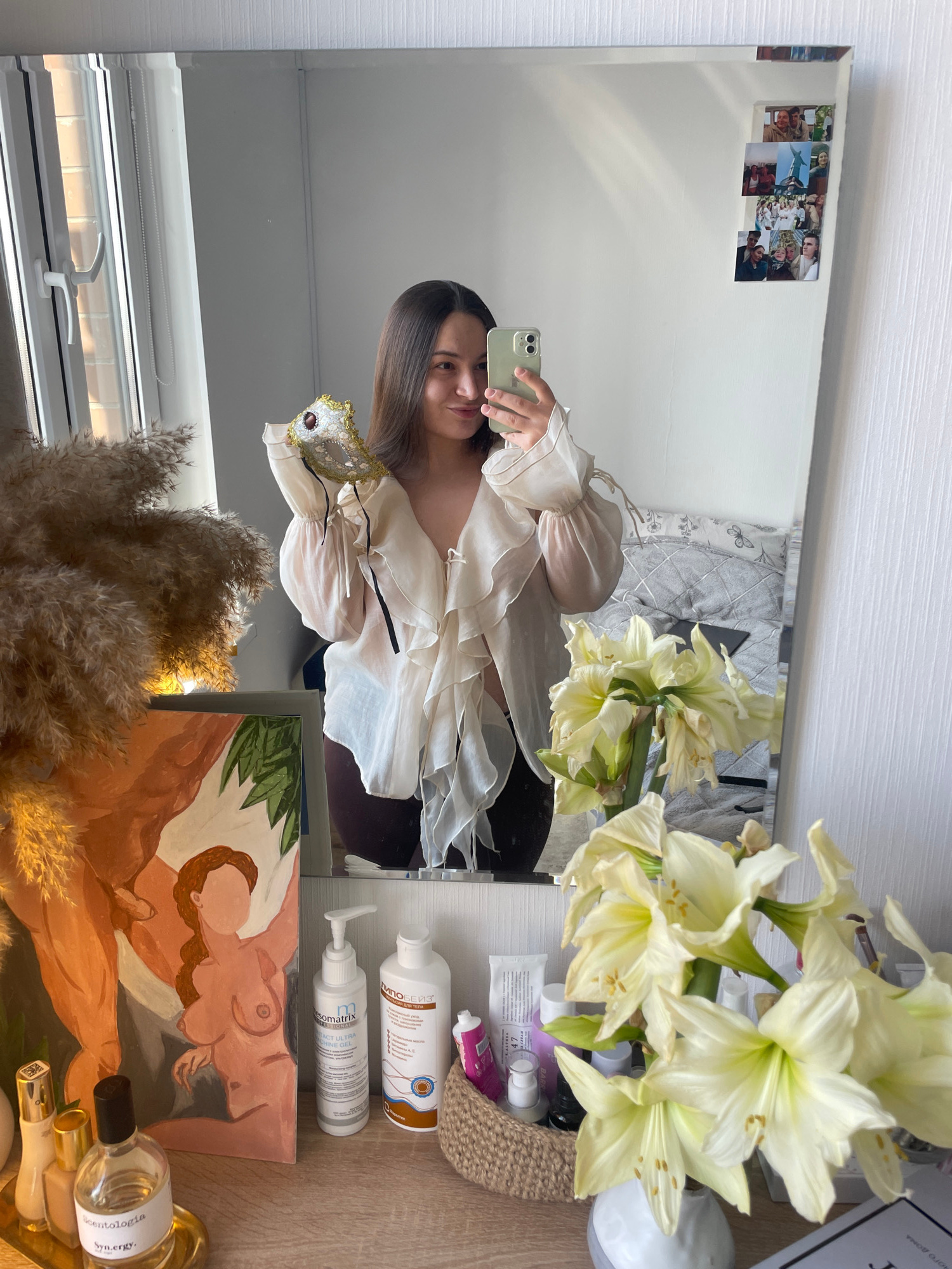 A young woman takes a selfie in front of a mirror. She is holding a white mask in her left hand and a green smartphone in her right. She is wearing a ruffled, white blouse. The mirror shows her reflec…read more