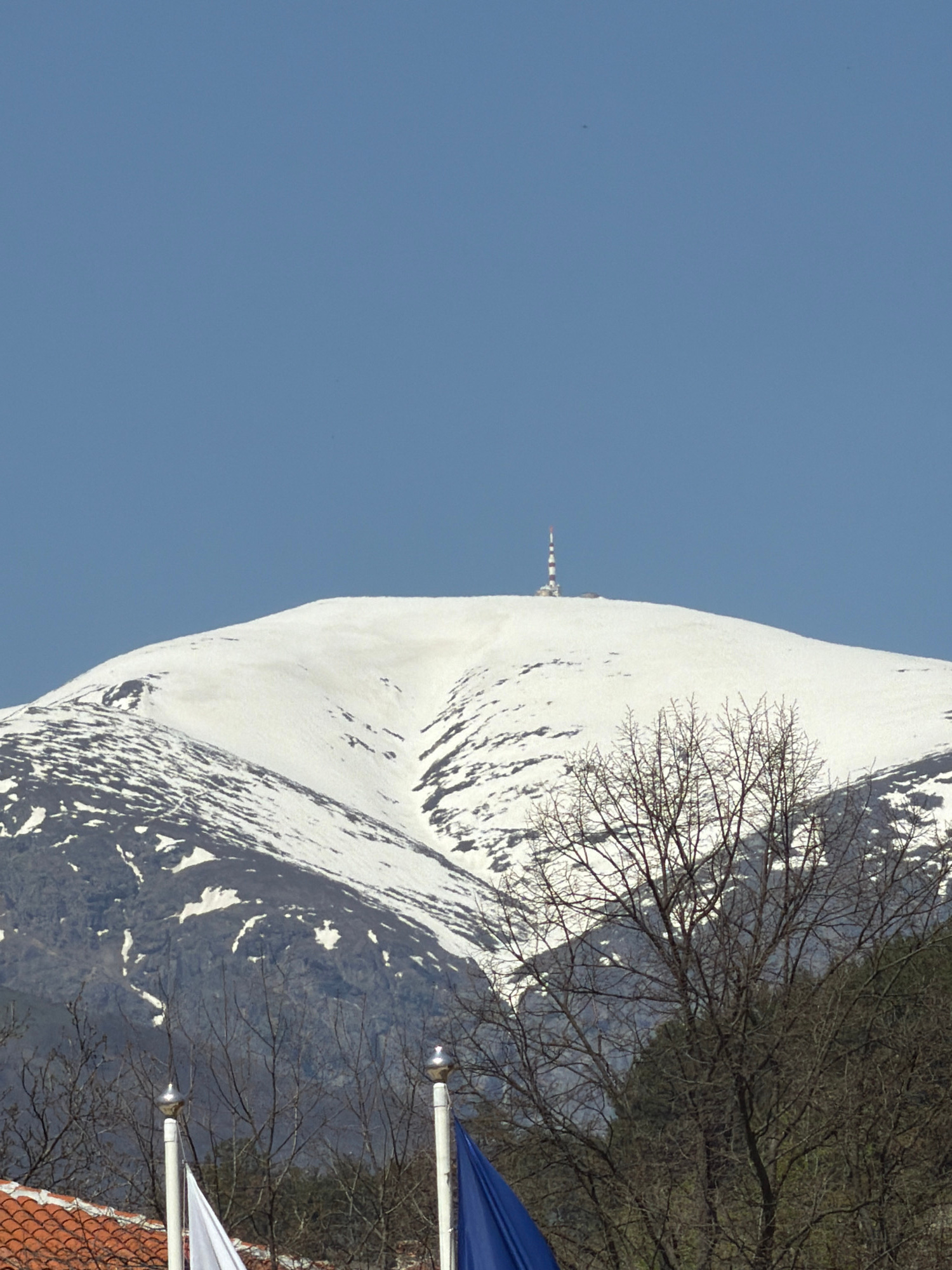 The image captures a panoramic view dominated by a vast, snow-covered mountain under a clear blue sky. The mountain, blanketed in white with visible rocky patches and folds, occupies the left and cent…read more