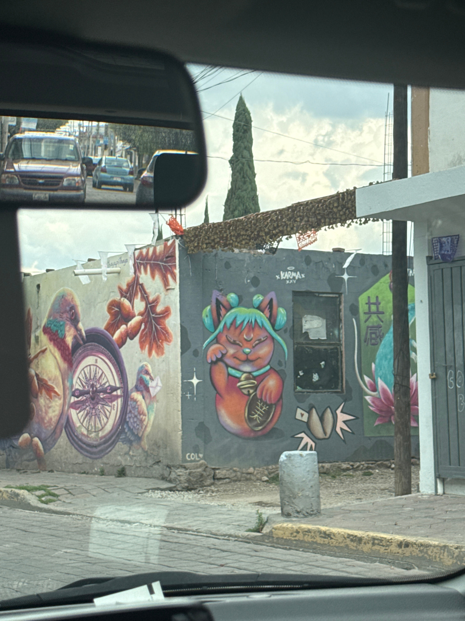 The image shows a street scene in San Andrés Cholula, Mexico, viewed from inside a vehicle. A building wall is visible, adorned with colorful street art. The artwork features elements such as a styliz…read more