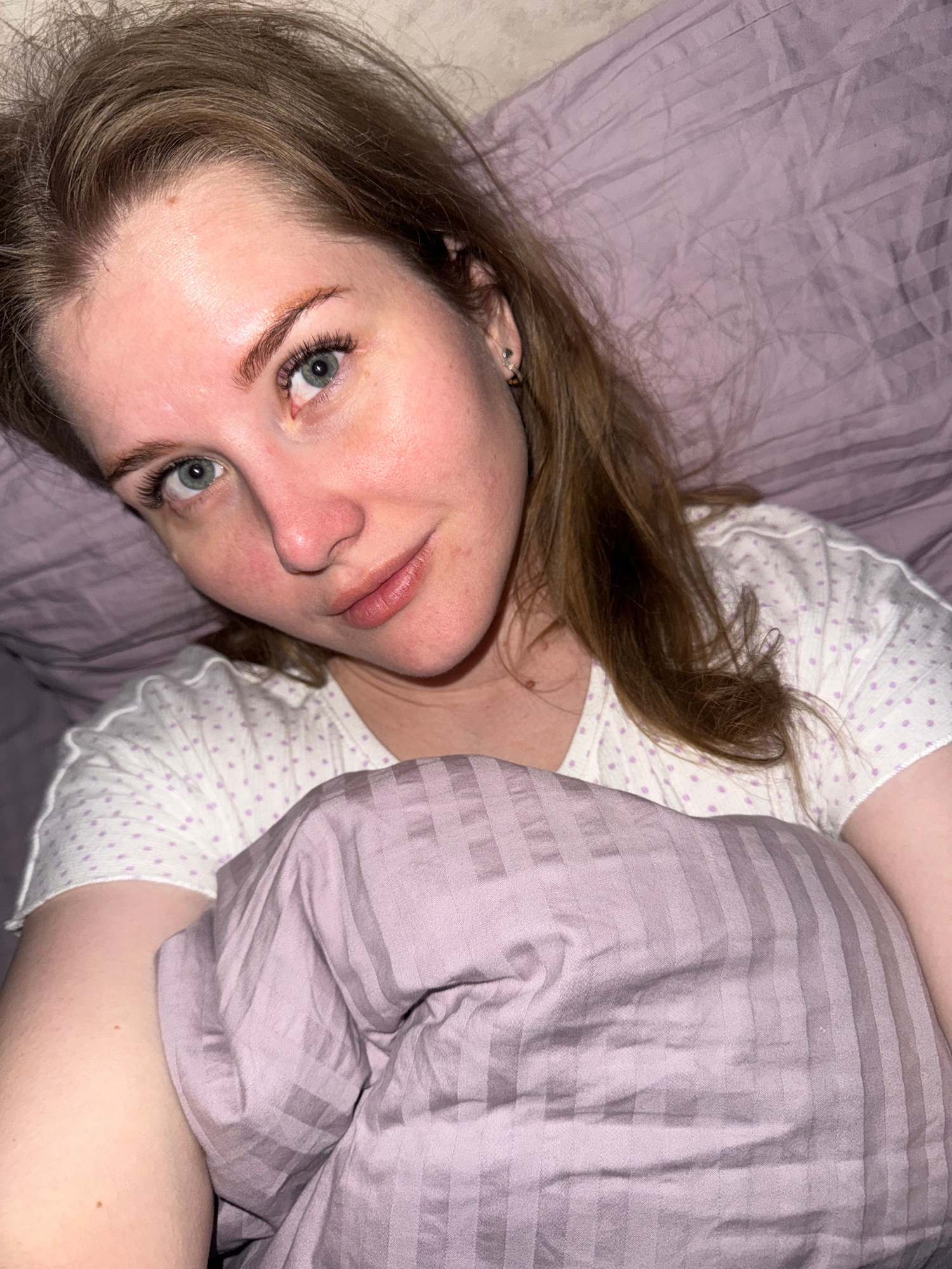 A woman with fair skin, light brown hair, and blue eyes is lying in bed. She is partially covered by a light purple blanket with horizontal stripes. She is wearing a white shirt with light purple polk…read more