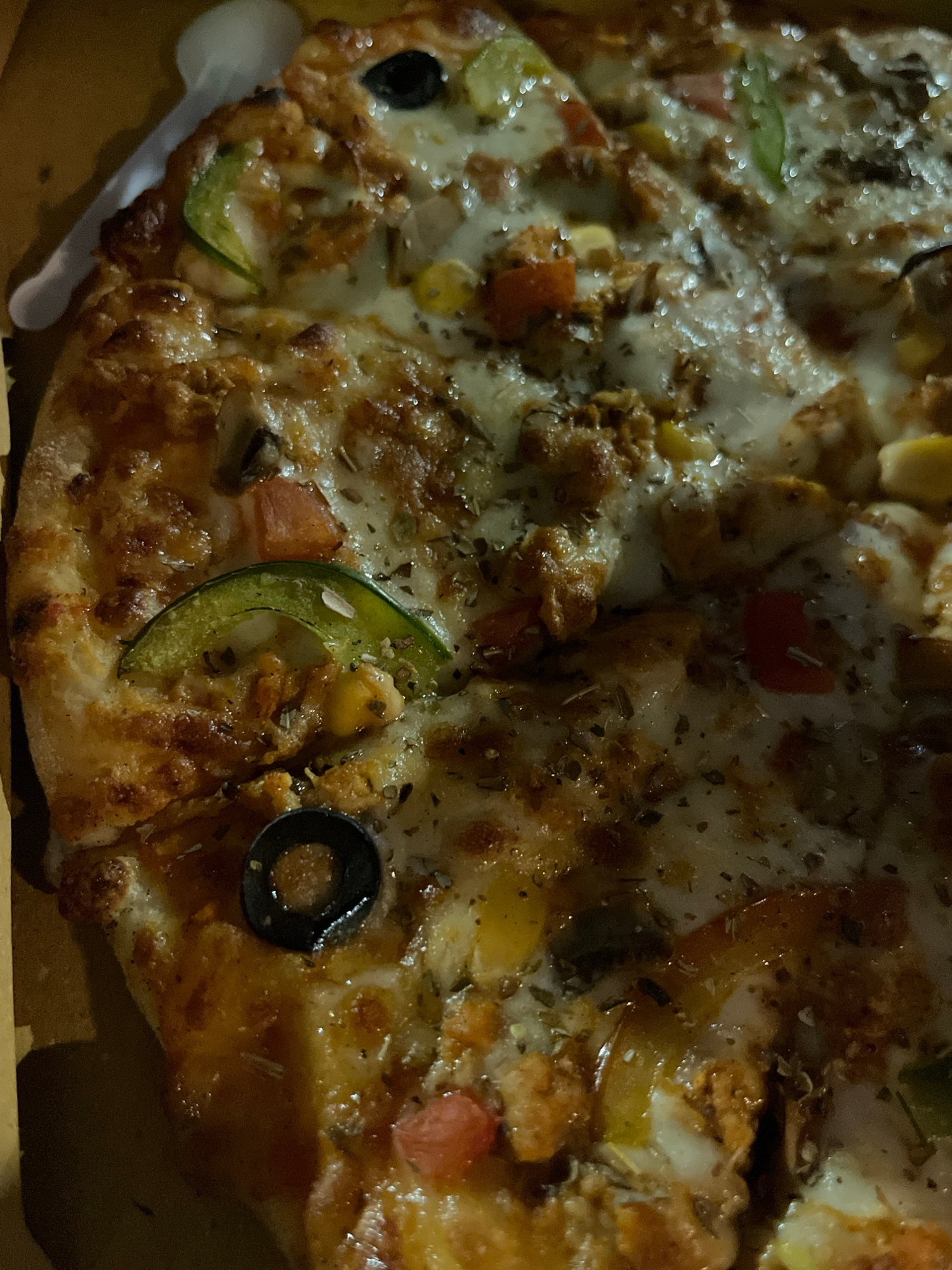 A close-up shot depicts a partially consumed pizza in its cardboard container. Toppings include melted cheese, olives, corn, green bell peppers, tomatoes, and meat. The image was taken indoors in Dhak…read more