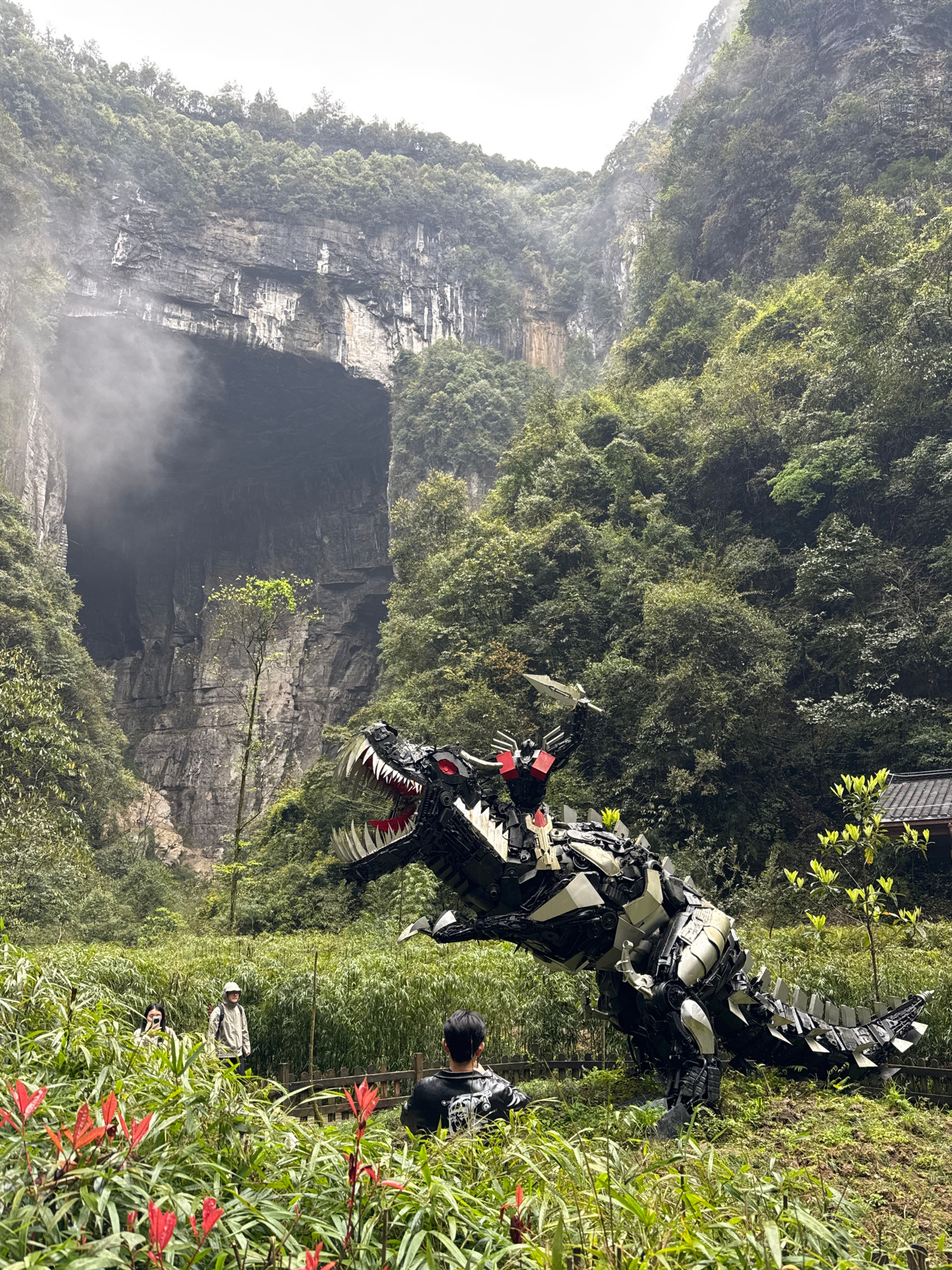 The image depicts a large, metallic dinosaur statue positioned near a deep sinkhole in the city of Wulong District, China. The statue is primarily black and silver with red accents around the eyes and…read more