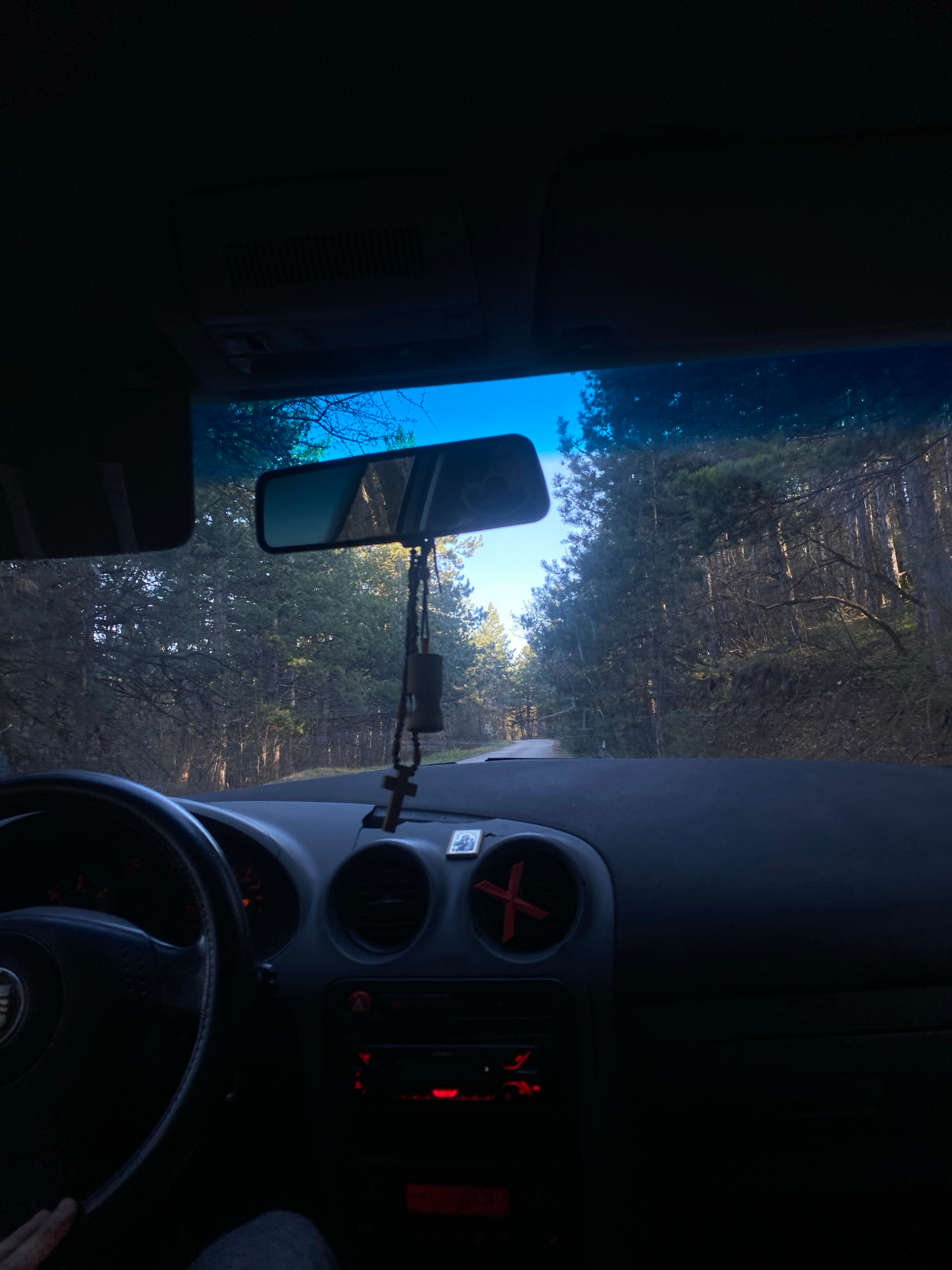 The image shows the interior of a car, specifically the driver's seat perspective, looking out through the windshield. The car is on a road surrounded by trees. A rearview mirror is visible in the cen…read more