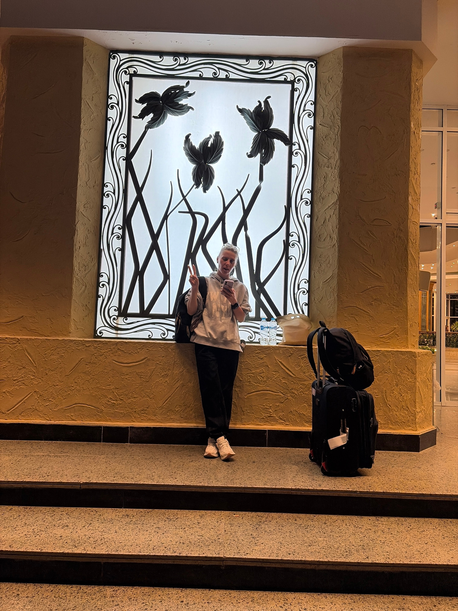 A person stands in front of a decorated wall feature with luggage, seemingly in an indoor space. The person is holding a phone and is wearing a light-colored hooded sweatshirt, dark pants, and white s…read more