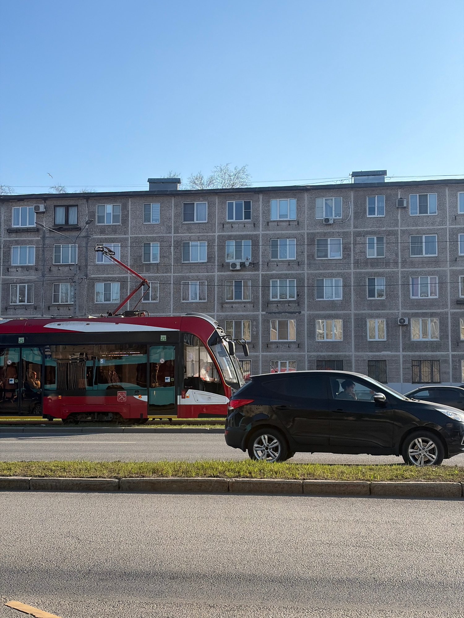 A street scene in Saint Petersburg, Russia, shows a drab, gray apartment building as a backdrop. In the foreground, parallel to the building and along the edge of a paved road, are a black car and a r…read more