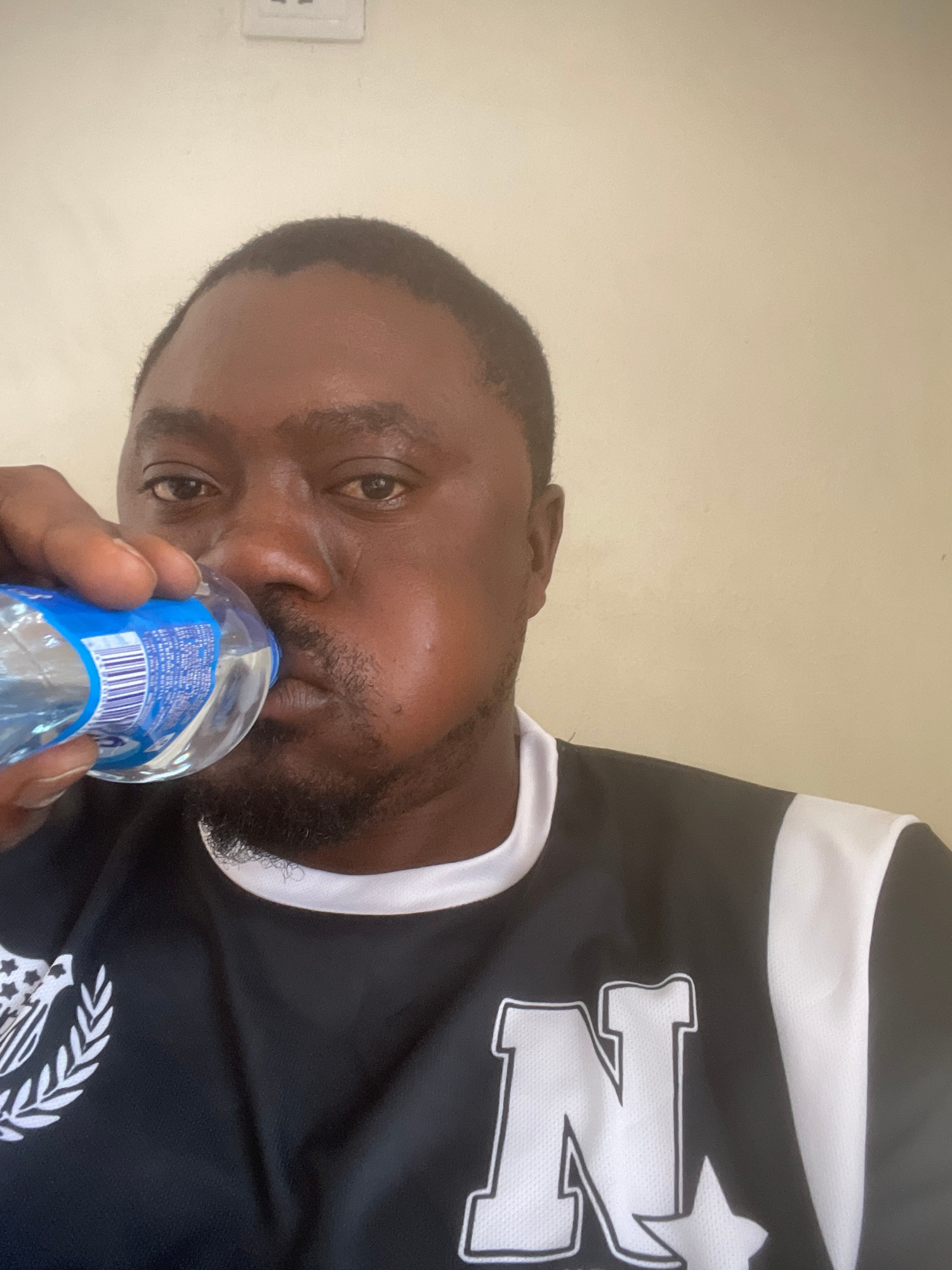 An adult man with dark skin, short dark hair, and a short beard is depicted in a close-up, portrait-style image, rotated 90 degrees counter-clockwise. He is looking directly at the camera with a neutr…read more