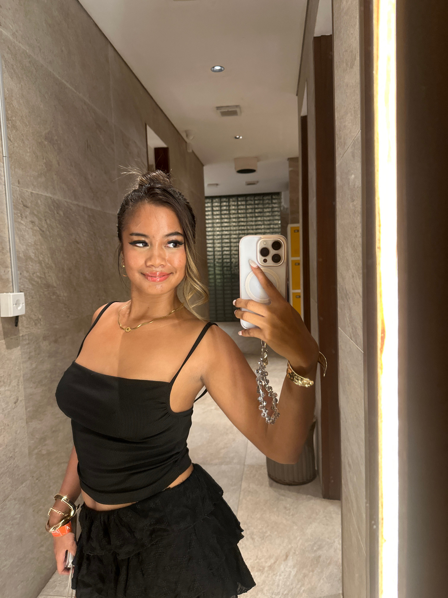 A young woman is captured in a mirror selfie, posing with a bright, confident smile. She holds a white smartphone, likely an iPhone with multiple cameras, in her left hand, which features a white circ…read more