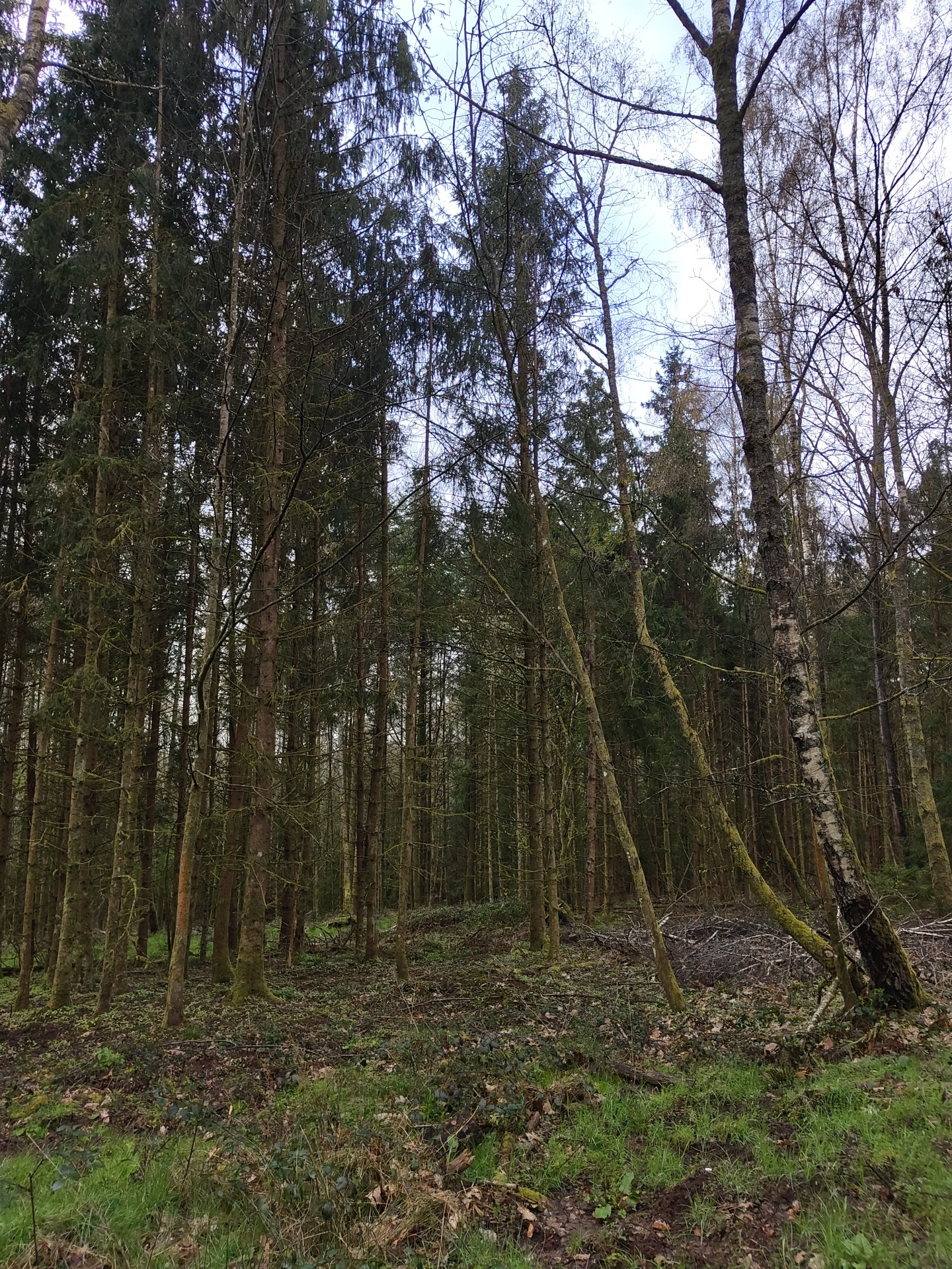 The image depicts a dense forest in Mettlach, Germany. The camera is oriented upwards, capturing the tall, thin trunks of coniferous trees that fill most of the frame. The ground is visible in the low…read more