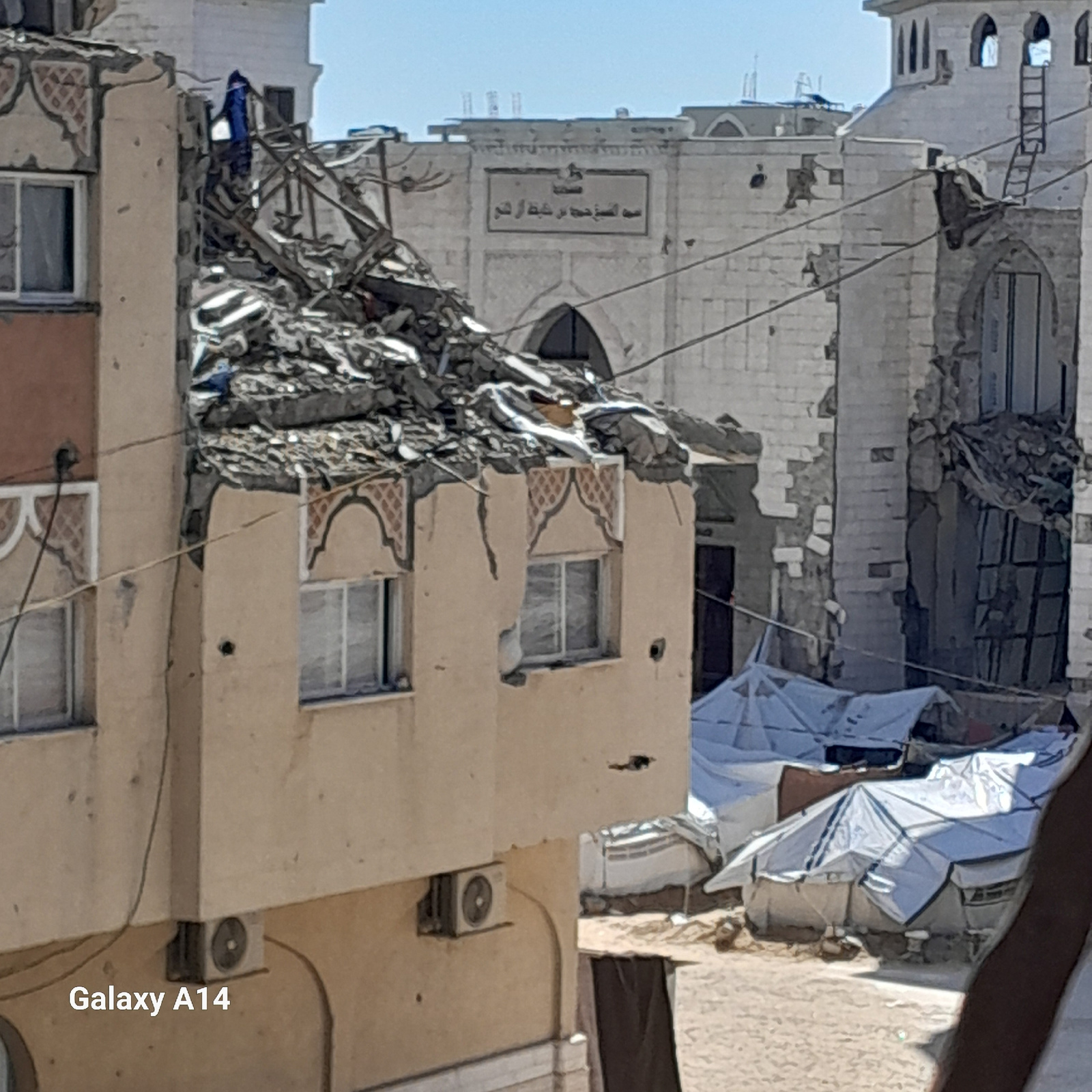 The image depicts an urban landscape in Khan Yunis, Palestinian Territory, characterized by extensive structural damage under a clear blue sky. In the foreground left, a multi-story building, light br…read more