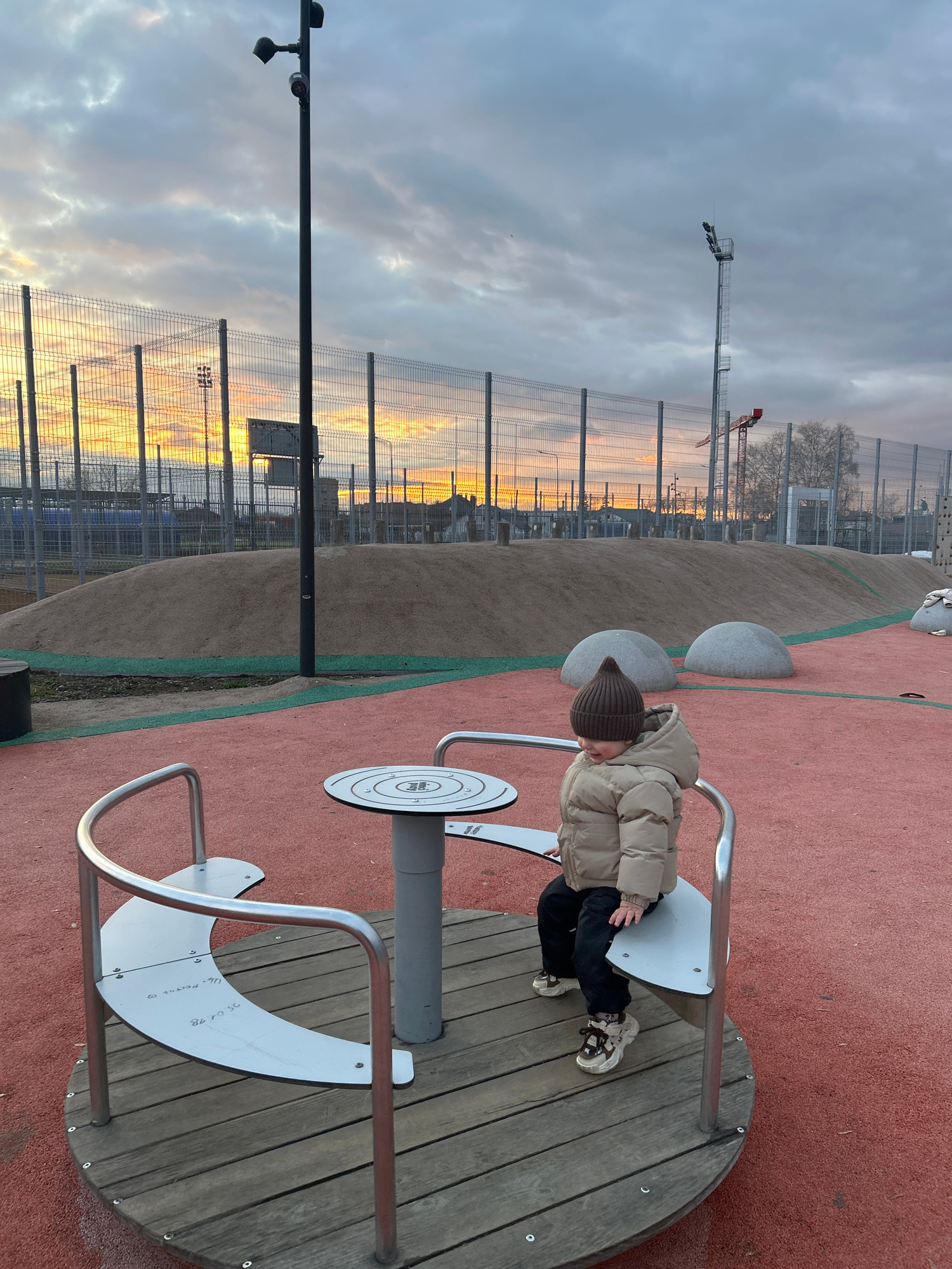 A child in a brown puffer jacket and beanie is sitting on a playground ride, with his head down. The ride is made of wood and has metal railings and seat-like attachments. The playground has a soft re…read more
