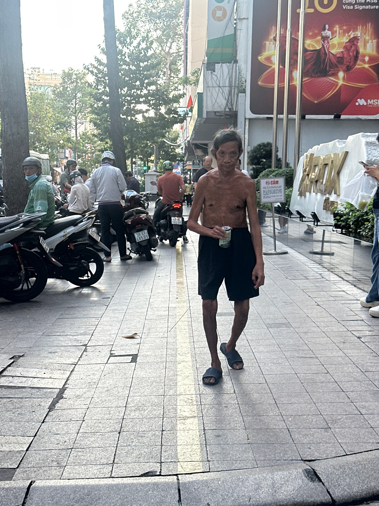 An outdoor street scene in Thủ Đức, Vietnam, is depicted during daytime. In the central foreground, a shirtless, lean man with dark hair and black shorts walks towards the viewer's left, holding a gre…read more