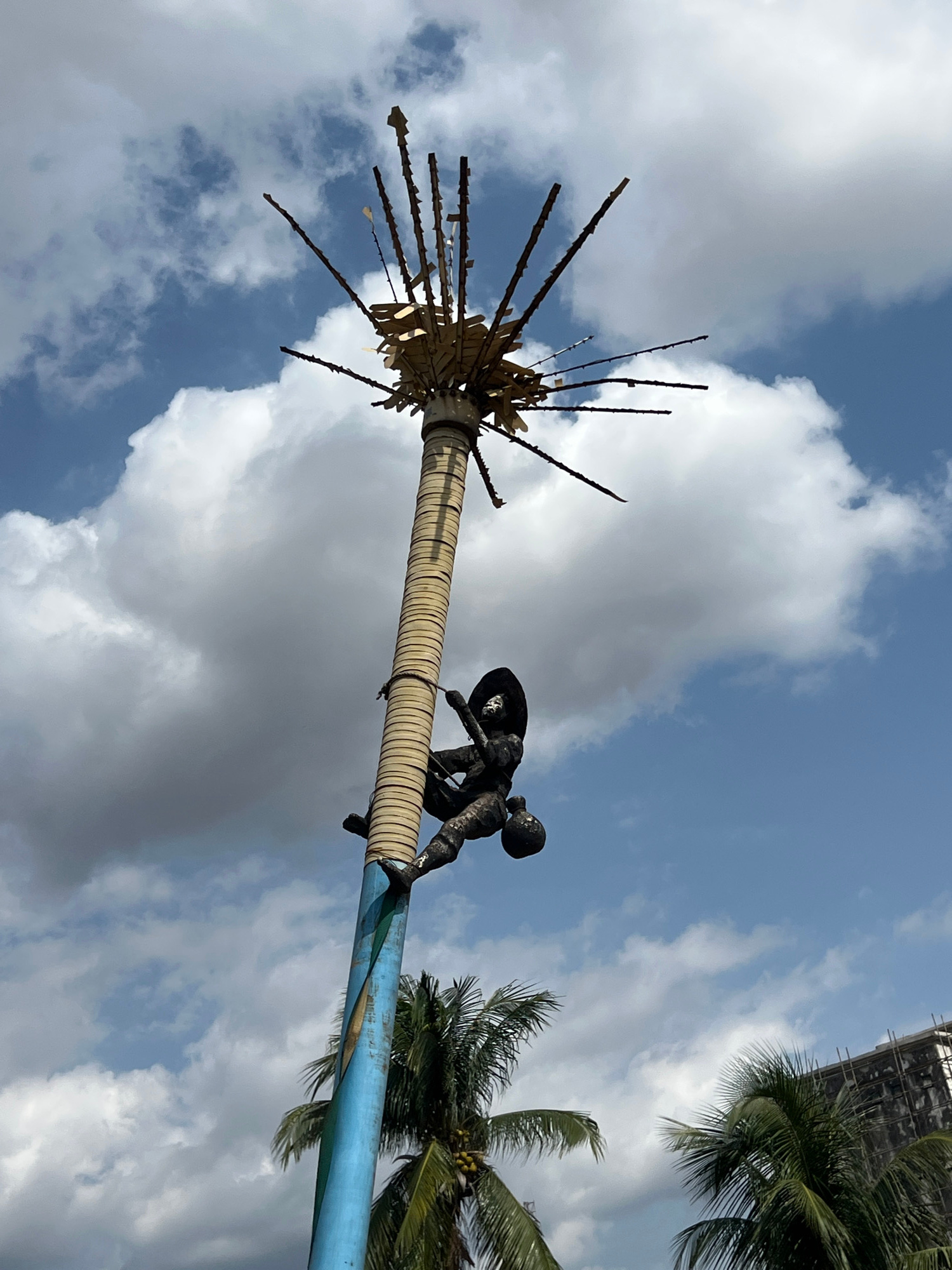 The image, captured from a low angle, presents a tall, decorated pole angled diagonally upwards against a bright blue sky with scattered white clouds. The pole is composed of two distinct sections. T…read more