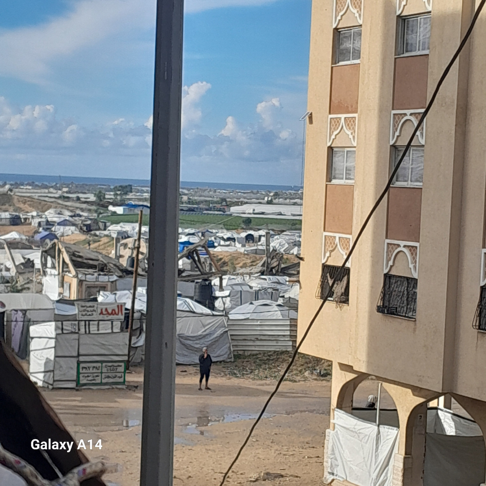 An elevated viewpoint captures a broad outdoor scene in Khan Yunis, Palestinian Territory, under a partly cloudy sky with a visible horizon of the Mediterranean Sea. In the immediate foreground, a da…read more
