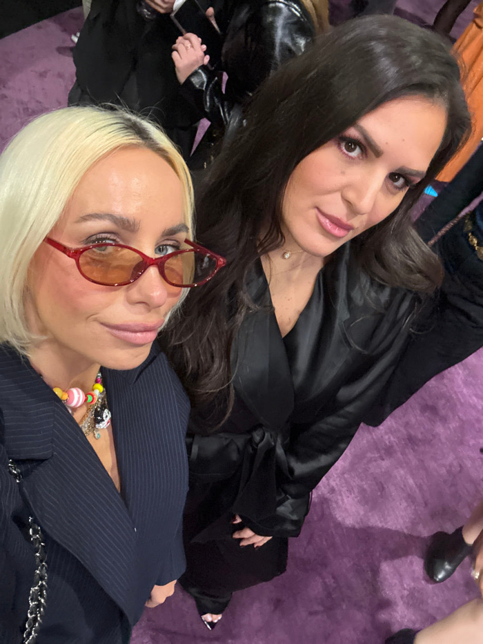 This image captures two adult females posing at an indoor event in Dubai, United Arab Emirates. The foreground features two women. The woman on the left has blonde hair with visible dark roots and fa…read more