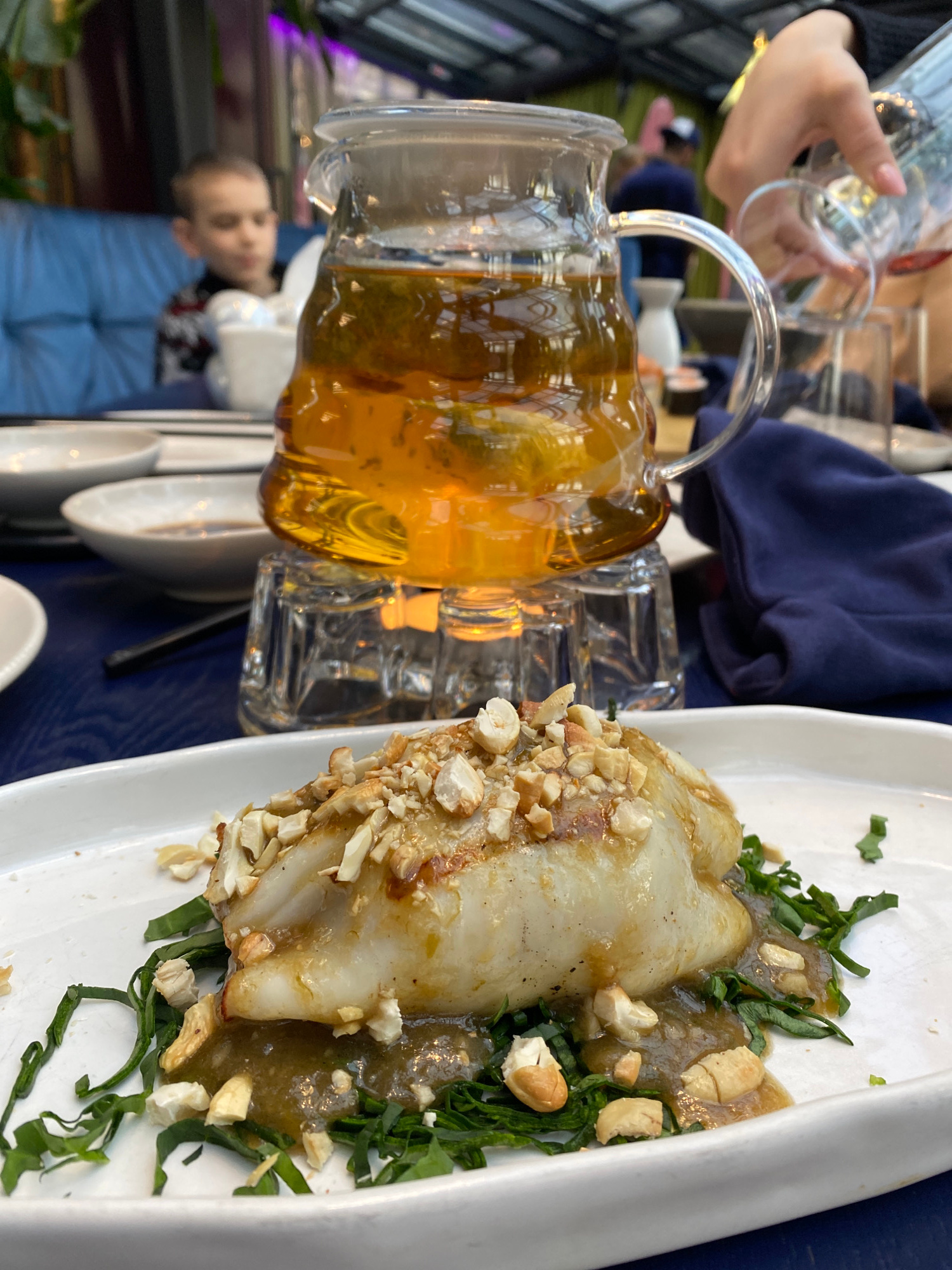 Here is a detailed description of the image: **Scene:** The image shows a table setting, likely in a restaurant, with a plate of food and beverages. **Food:** A white oblong plate holds a dish consi…read more