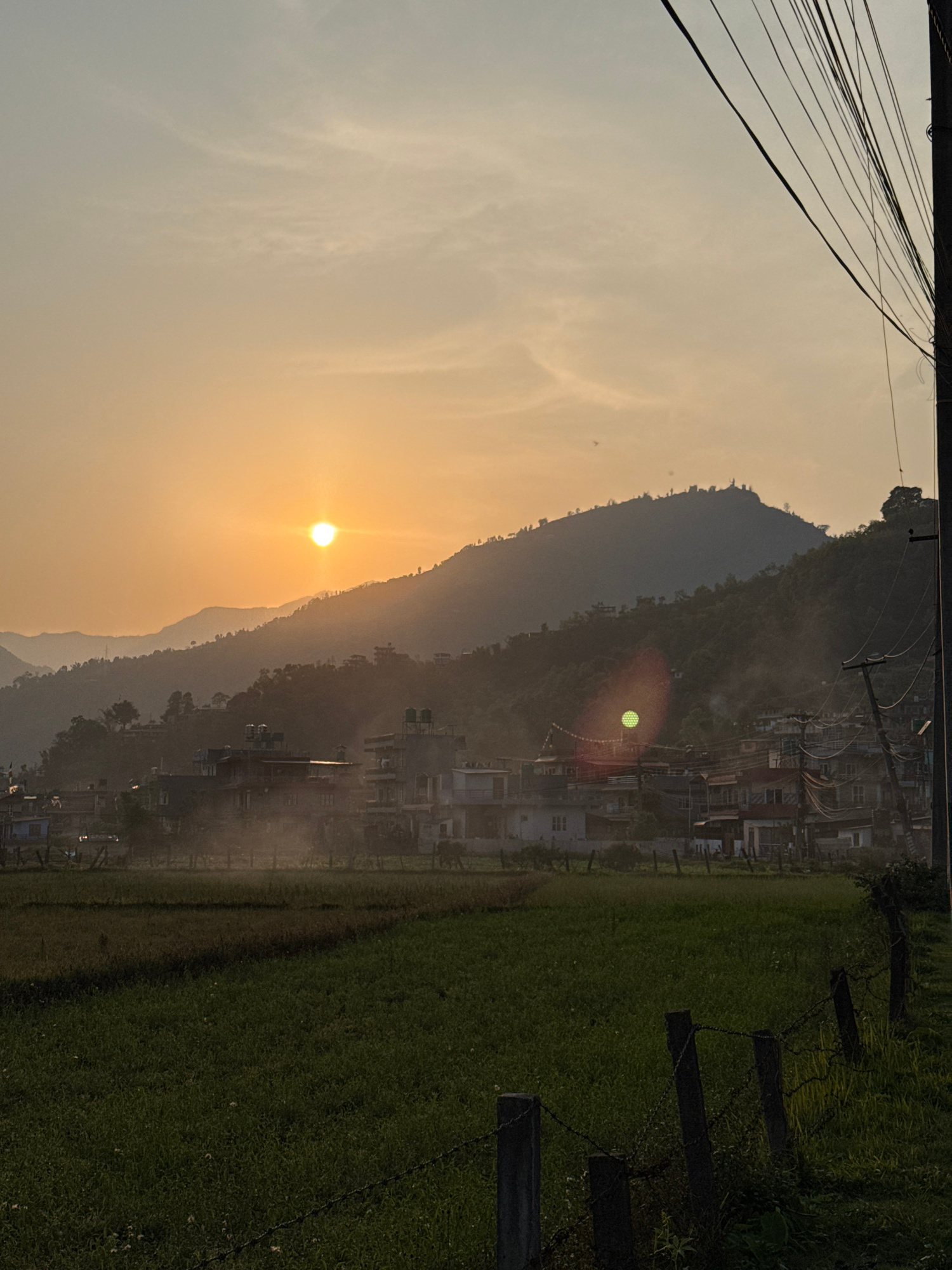 The image depicts a landscape at sunrise or sunset, likely taken in the vicinity of Pokhara, Nepal, given the mountainous backdrop and urban development. The sun is positioned behind a mountain range.…read more