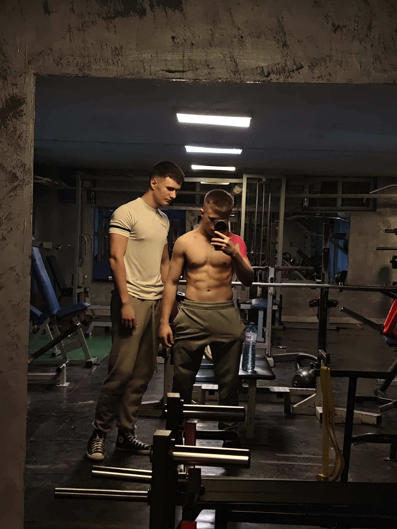 In a gym, likely in Kozloduy, Bulgaria, two young men are reflected in a mirror. The man on the left wears a light-colored t-shirt and matching sweatpants with dark sneakers. He is looking down toward…read more