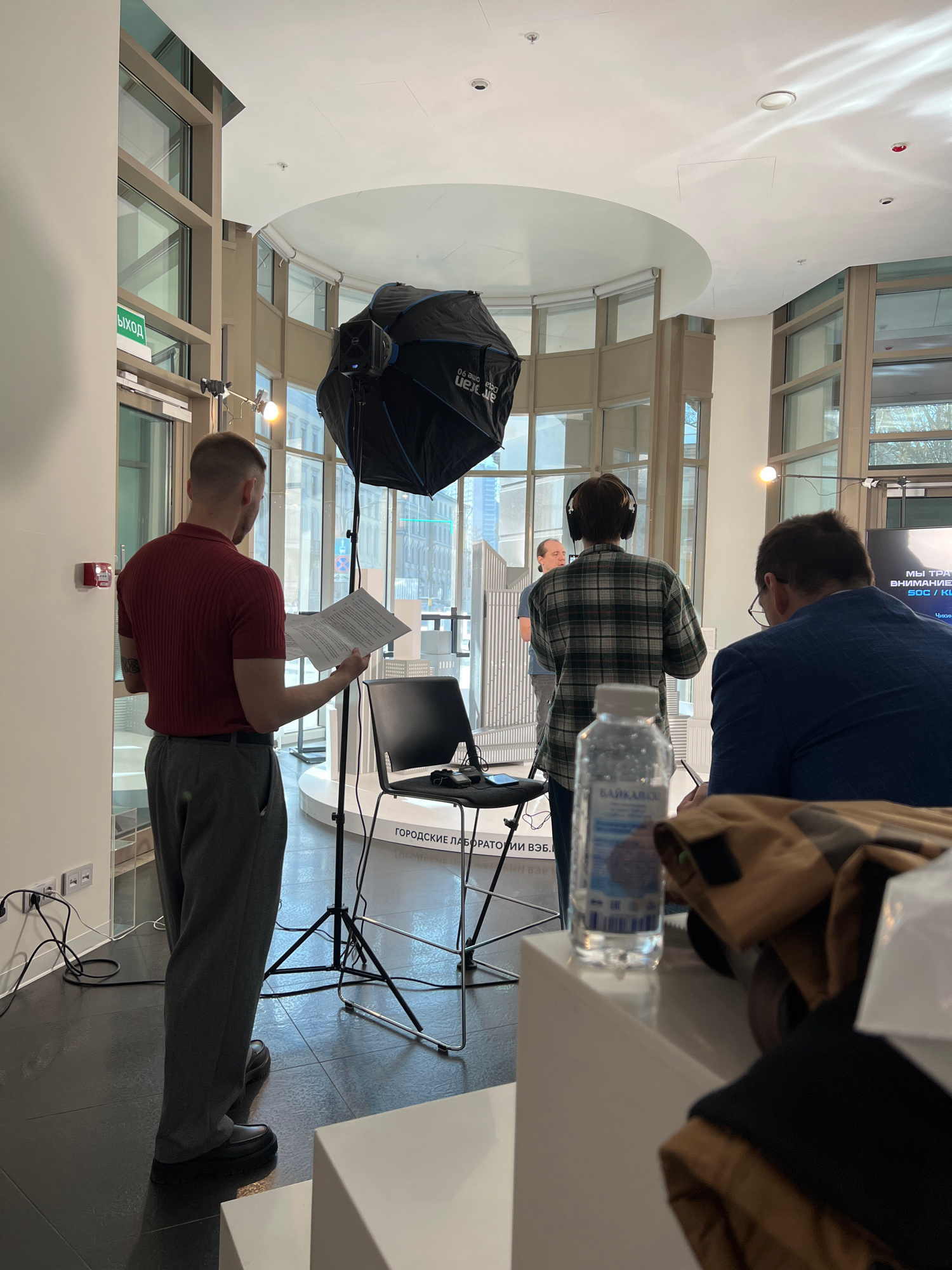 The image depicts an indoor scene in Moscow, Russia, within a modern, brightly lit facility identified by Cyrillic text as "ГОРОДСКИЕ ЛАБОРАТОРИИ ВЭБ" (Urban Laboratories VEB). The environment feature…read more