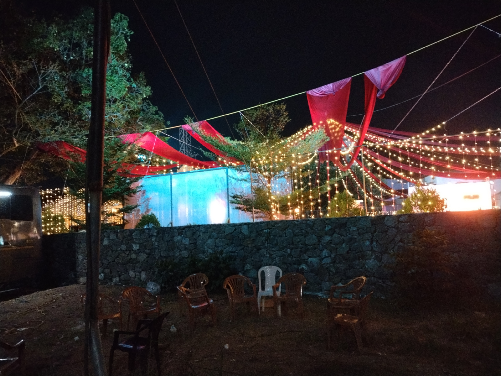 This is an outdoor night scene depicting a festive or event setup in Kalamassery, India. The setting is illuminated by numerous warm-toned string lights (fairy lights) draped across trees and overhead…read more