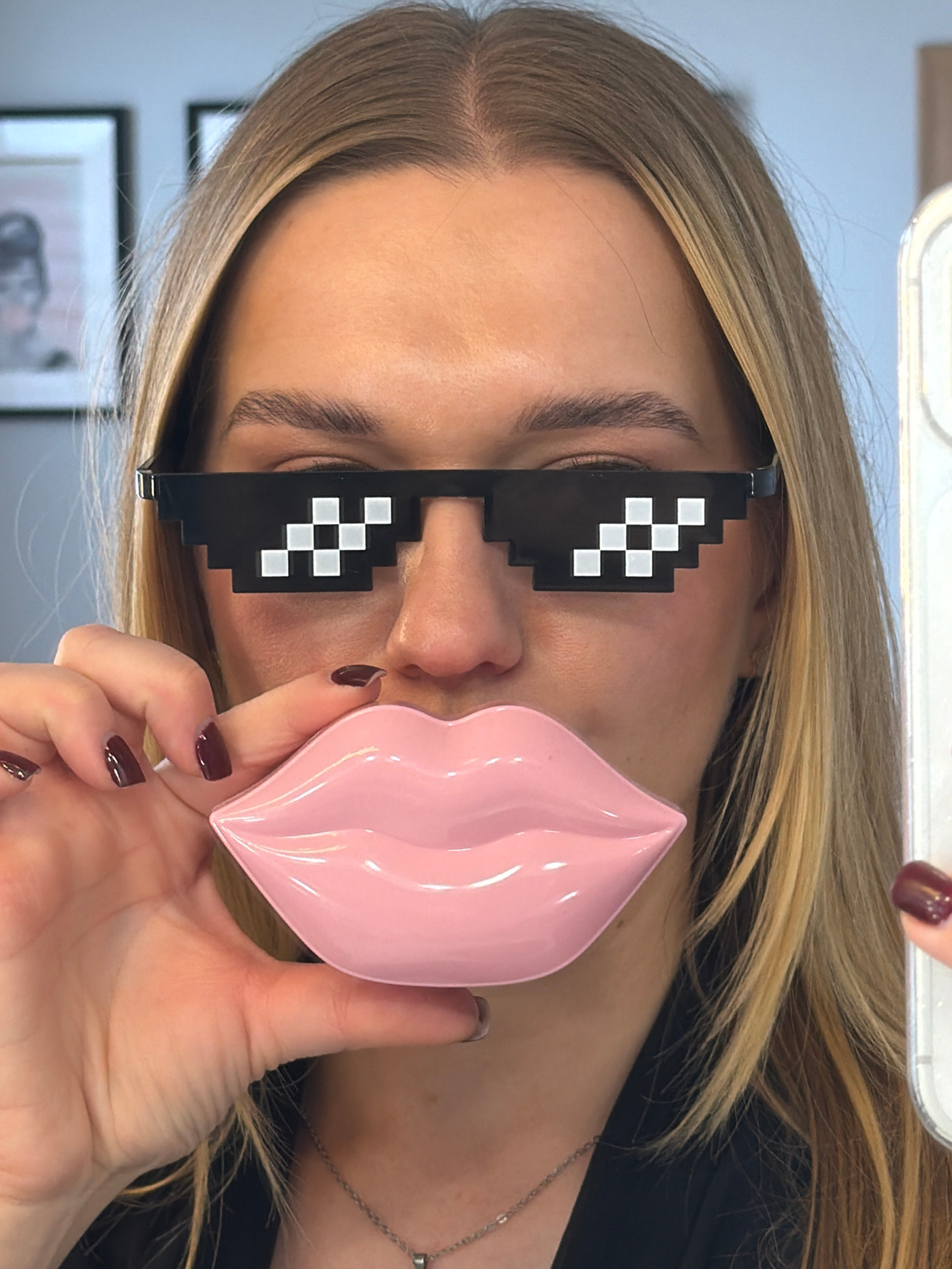 A woman with blonde hair and pixelated sunglasses is holding a pink, lip-shaped object. She is wearing dark nail polish and a silver necklace. The background includes framed artwork and a white surfac…read more