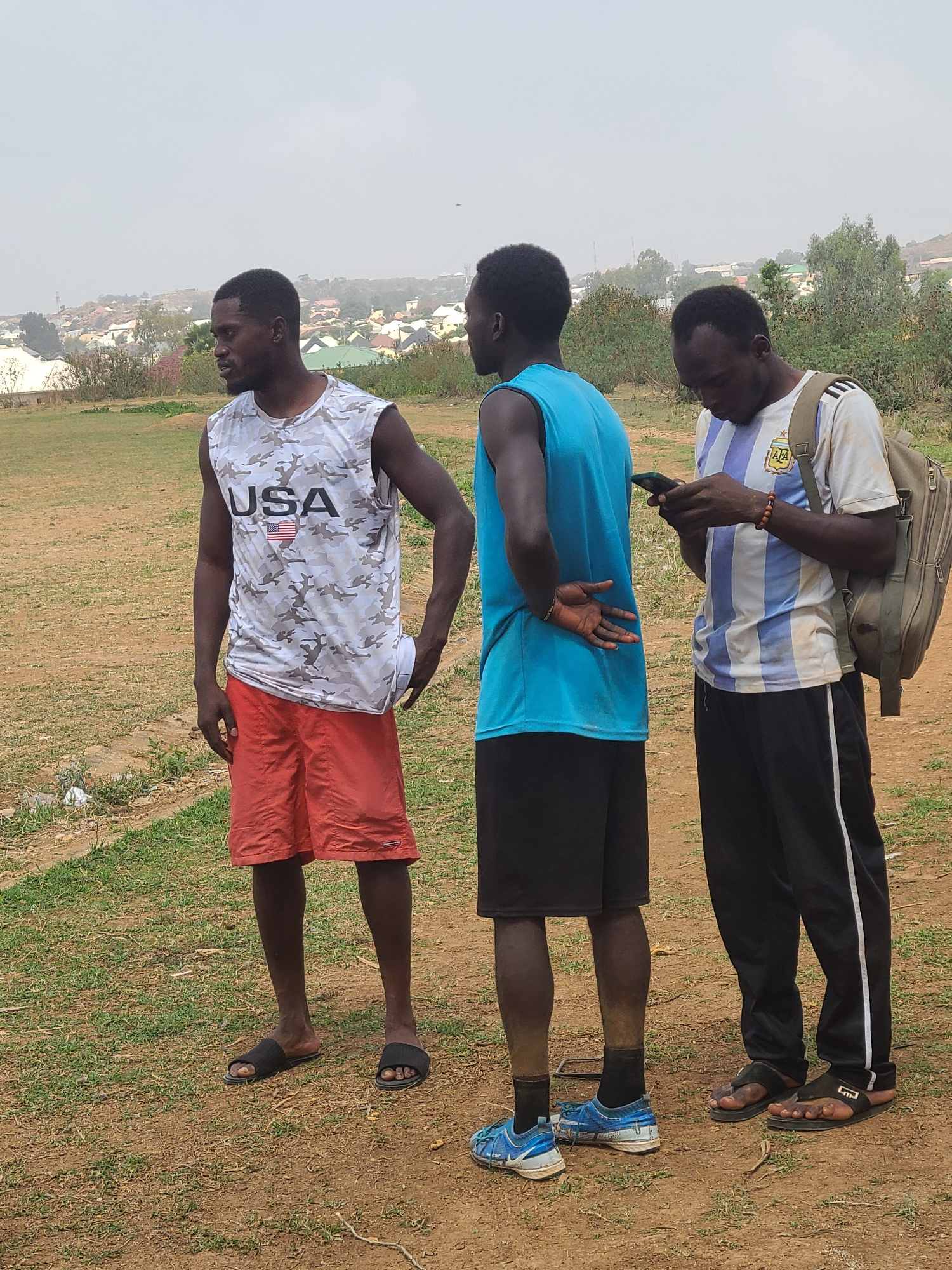 Three African men stand in a field. The man on the left wears a white and blue striped Argentina soccer jersey, black sweatpants, and carries a beige backpack; he holds a black smartphone in his hands…read more