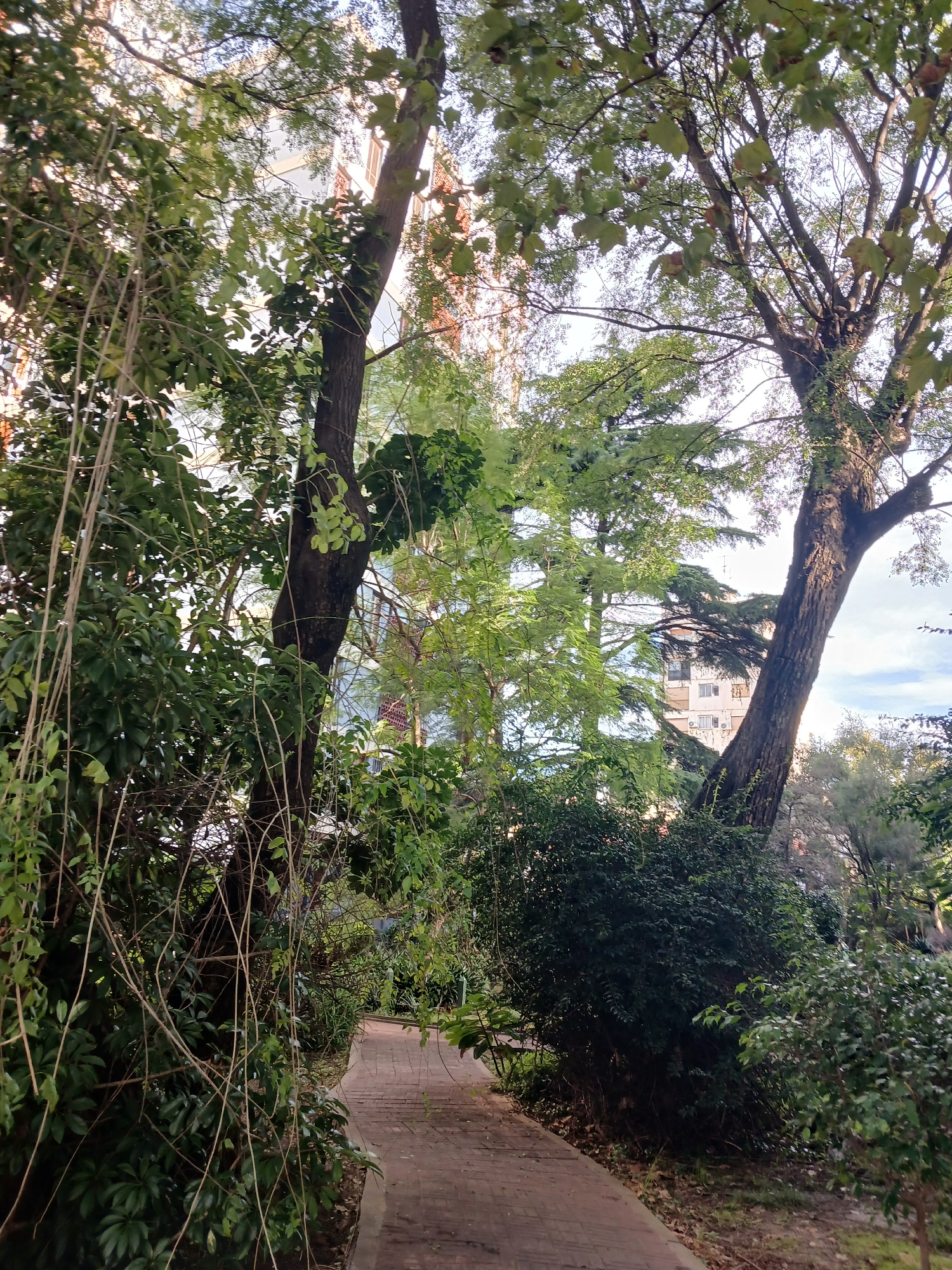 The image depicts a park in Buenos Aires, Argentina. The frame is filled with trees and greenery. A paved walkway is visible on the right side of the image, partially obscured by foliage. In the backg…read more