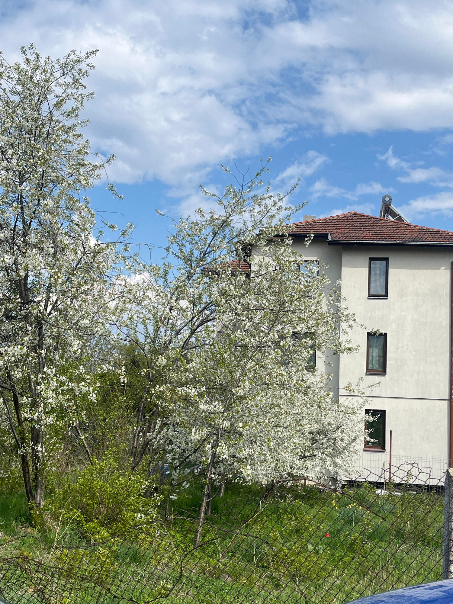 The image shows a two-story building with a light-colored facade and a brown tiled roof. Three rectangular windows are visible on the second story. A satellite dish is mounted on the roof. The buildinβ¦read more