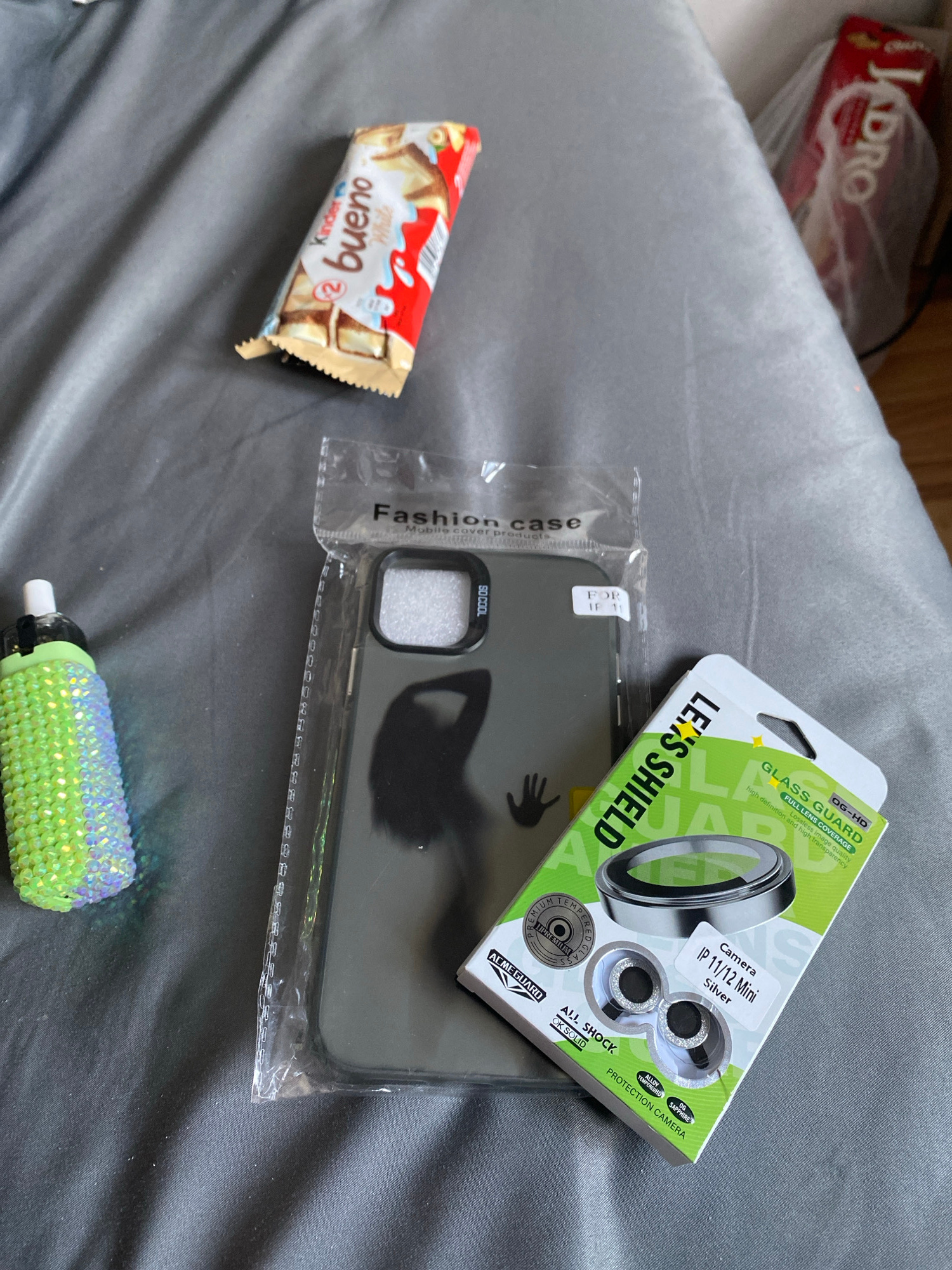 The image shows a gray wrinkled surface, possibly a bedsheet, with several items scattered on it. A Kinder Bueno chocolate bar is in the lower left corner. Next to it, there is a decorative, green-an…read more