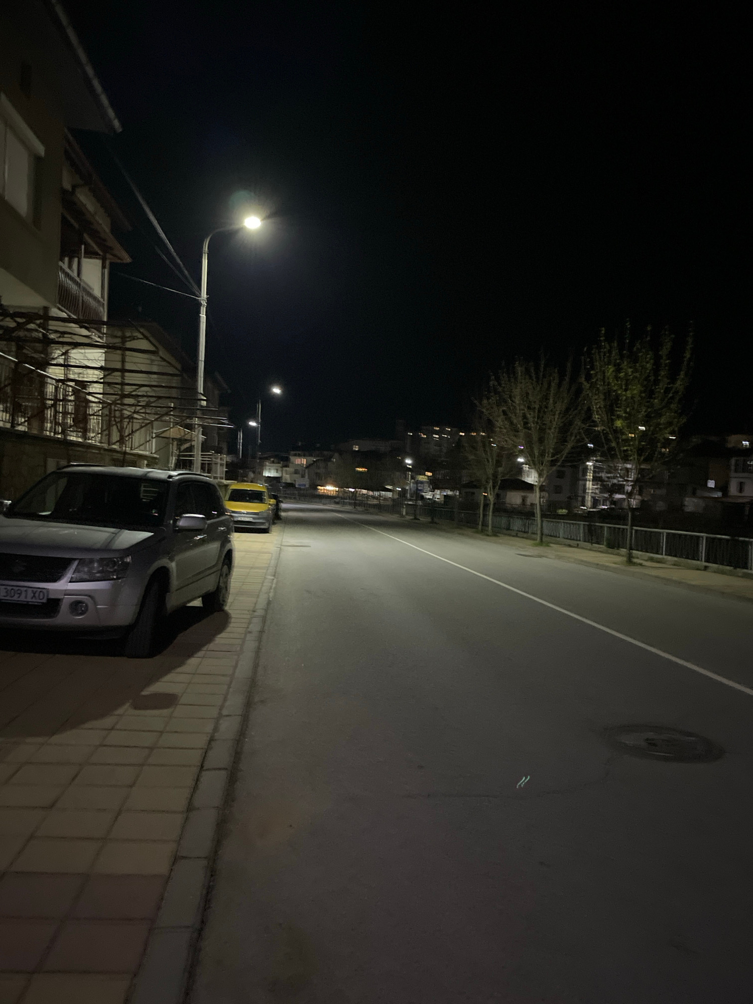 The image depicts a night scene in Zlatograd, Bulgaria. A street is lined with buildings, with a parked silver car and a yellow vehicle visible on the right side. Streetlights illuminate the scene, anβ¦read more