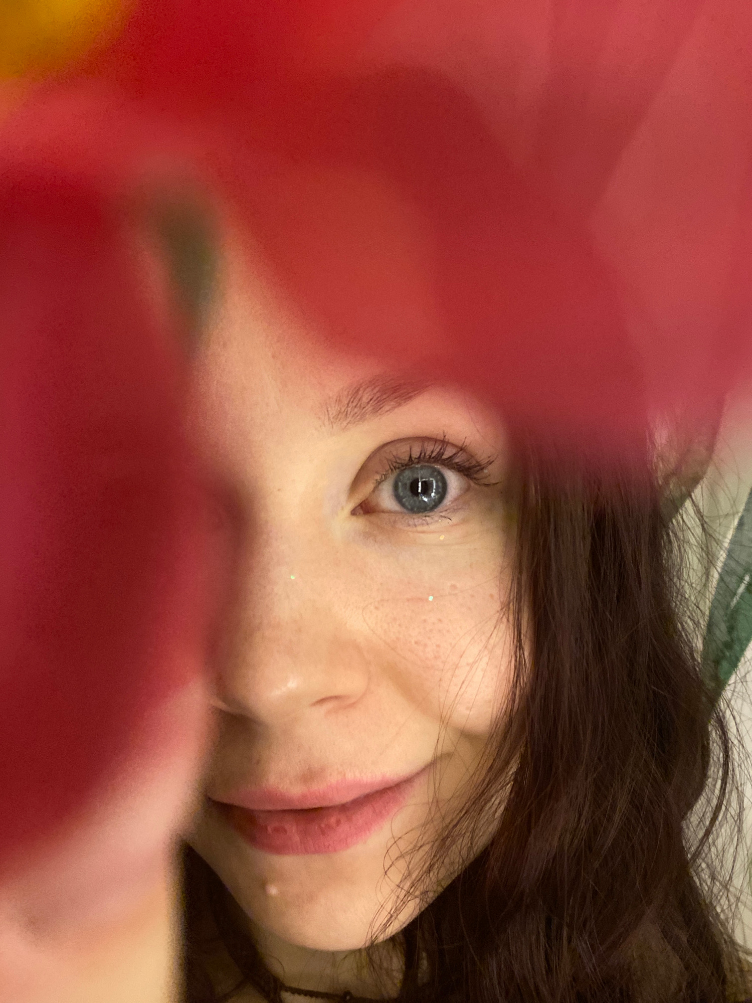 This is a close-up, rotated portrait of a person, likely female, looking directly at the camera with a subtle smile. A prominent, blurry red or pink mass occupies a significant portion of the foregrou…read more