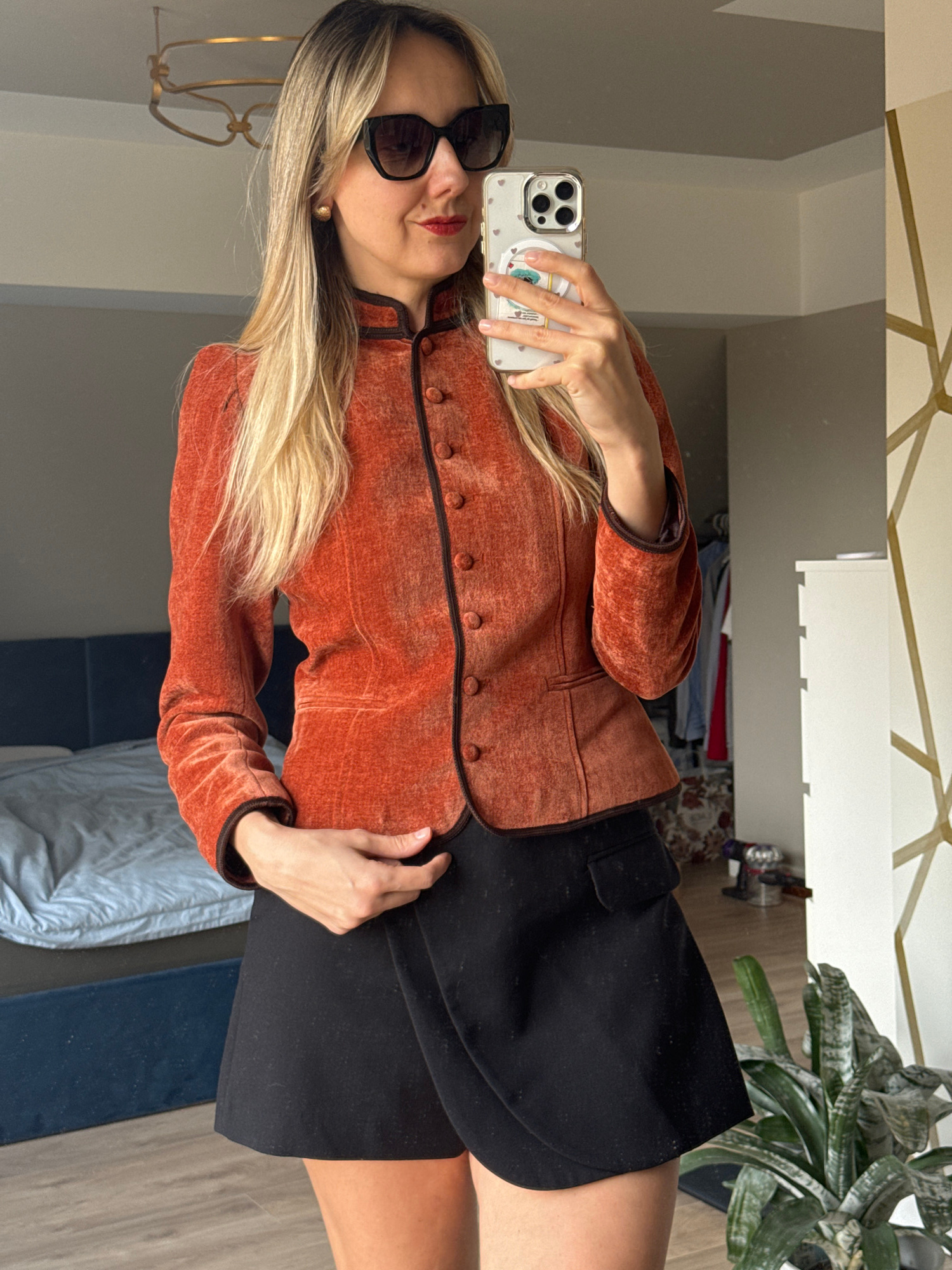 A female subject is depicted indoors, taking a mirror selfie in what appears to be a bedroom or dressing area in Carnikava, Latvia. The subject, with long blonde hair, is wearing oversized black sungl…read more