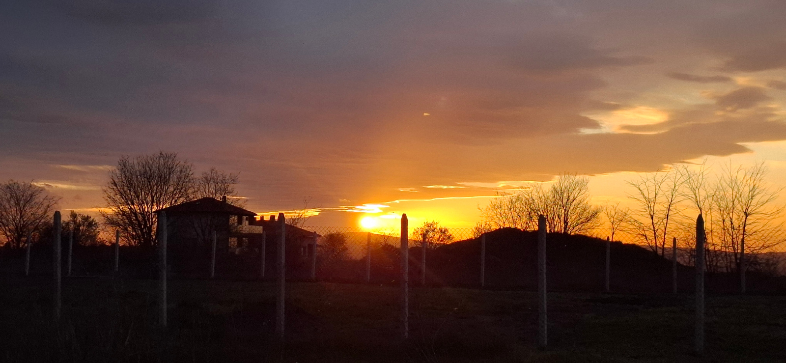 The image depicts a sunset scene in a rural area near the city of Unknown, Unknown. The sun is setting on the horizon, casting a vibrant orange and yellow glow across the sky, which is partially cover…read more