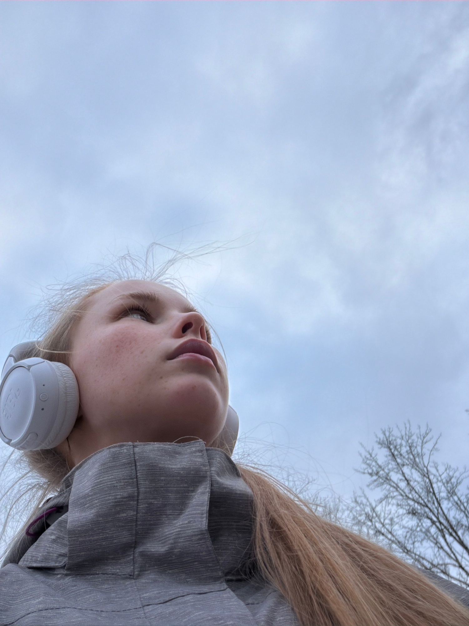 A low-angle shot depicts a young blonde woman wearing white headphones. She is looking upward, with a cloudy sky visible in the background. Bare tree branches are visible in the upper right corner. Thβ¦read more