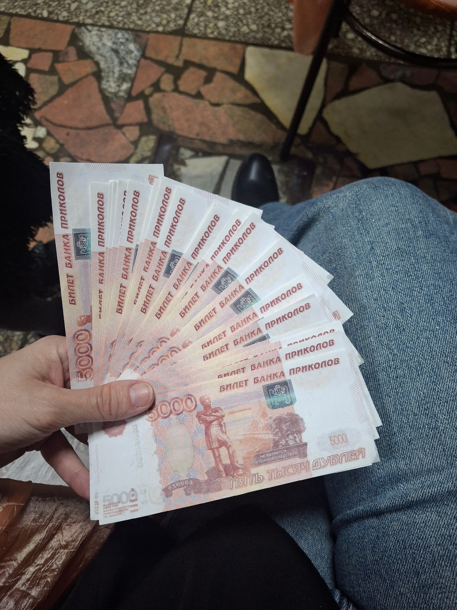 A person holds a fan of ten Russian 5000 "ticket bank pricolov" (joke bank tickets) in their right hand. The tickets are white with red writing and images. The person's hand is light-skinned and the f…read more