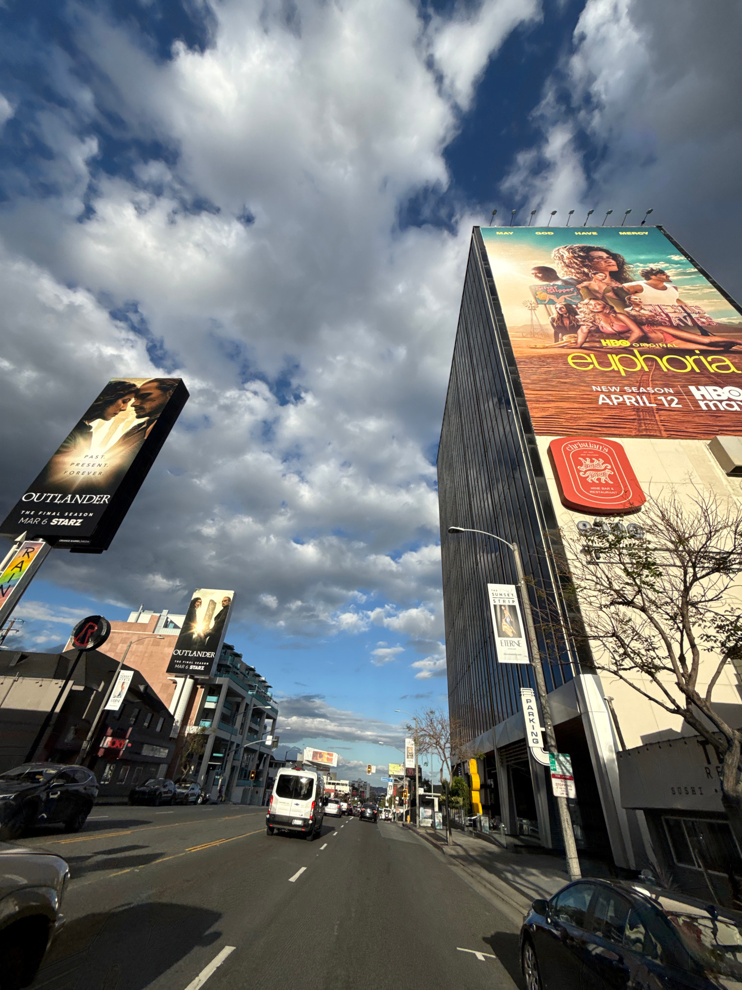 The image captures a street scene in West Hollywood, United States of America, under a sky with dramatic cloud formations. The view is from a street level perspective. The scene is dominated by billb…read more