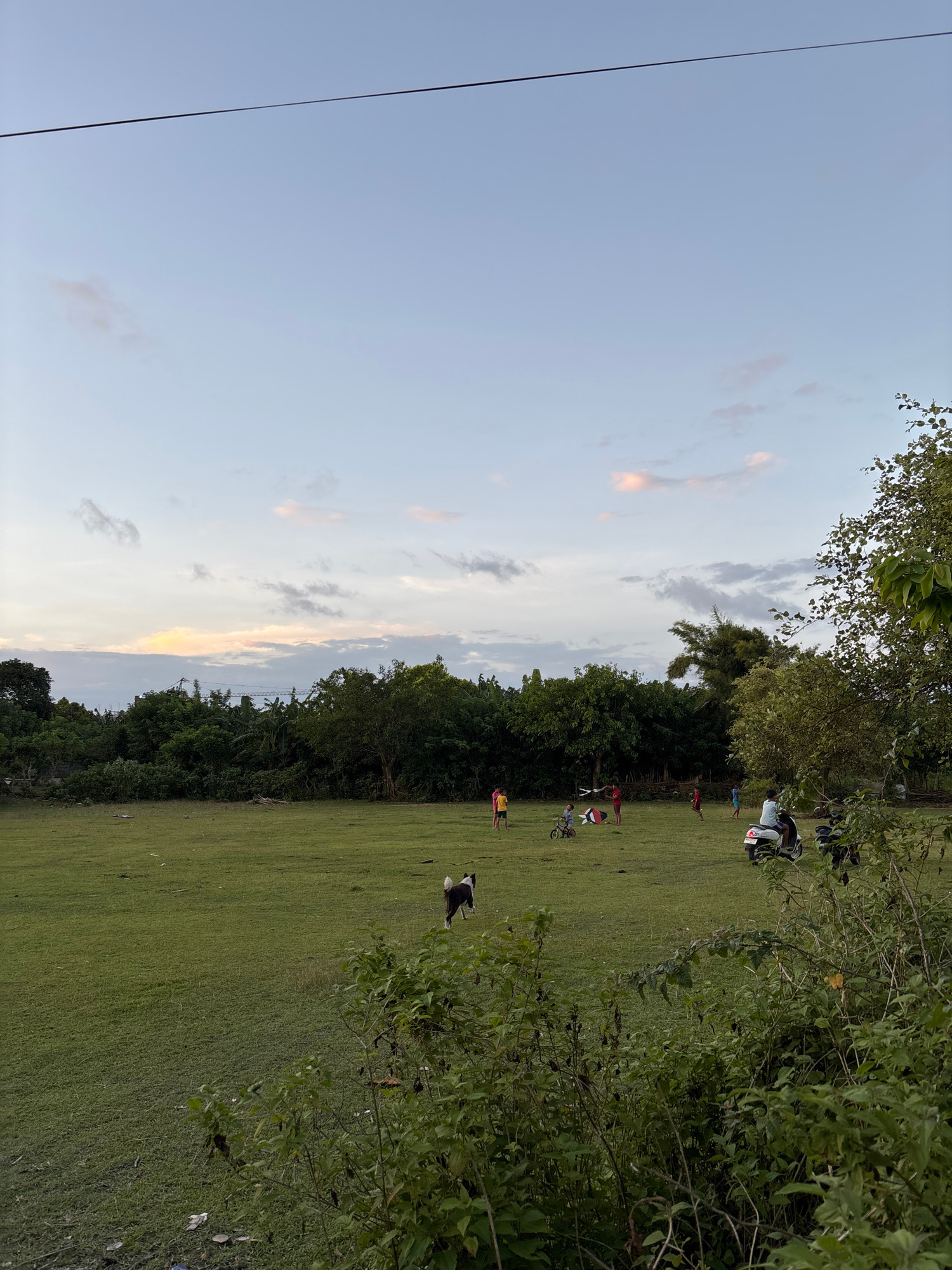 The image depicts a grassy field in Kuta Selatan, Indonesia, under a sky with wispy clouds. A line of trees borders one side of the field. Several people are scattered throughout the field, some stand…read more