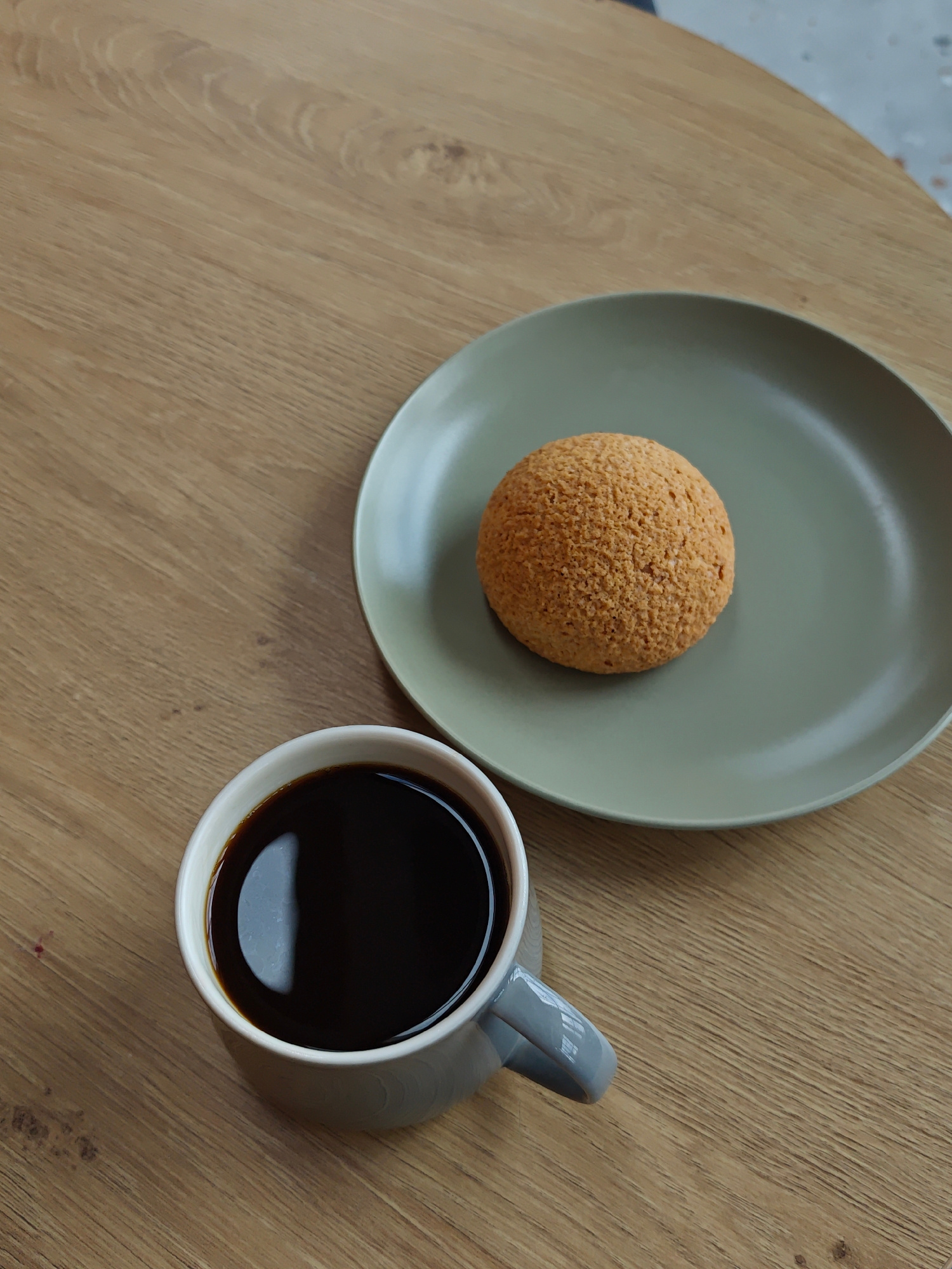 A high-angle shot features a light-brown, wood-grain table surface. A light-grey mug filled with dark coffee is positioned on the lower left. A light-green plate, holding a round, textured, light-brow…read more