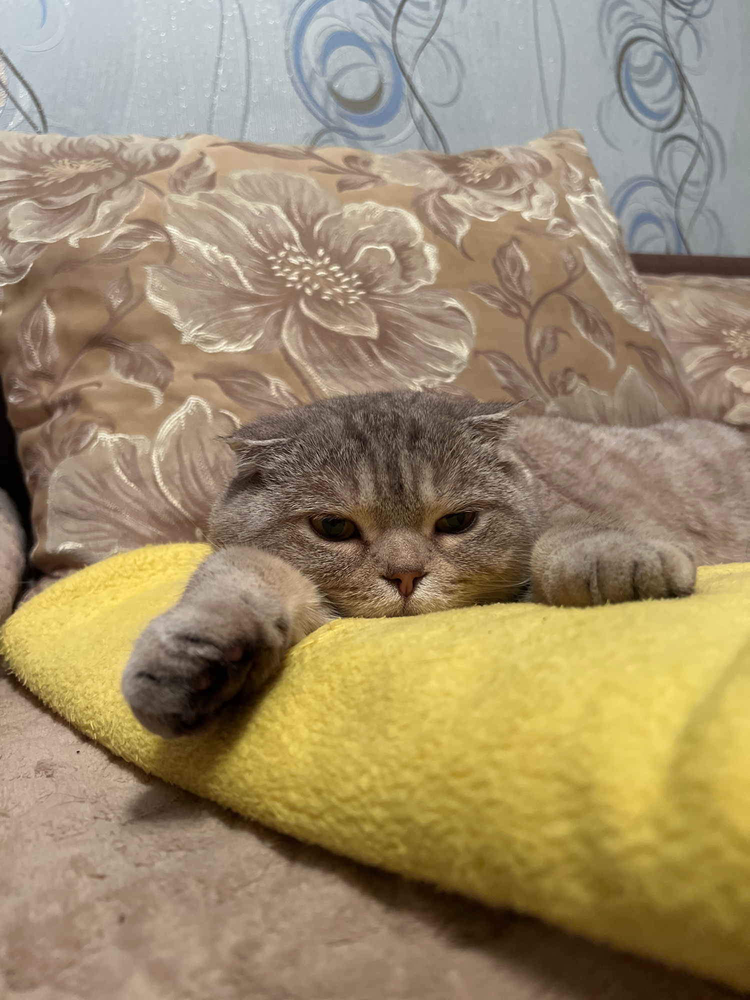 A gray Scottish Fold cat is lying on a floral patterned pillow and a yellow blanket. The cat is looking at the camera, and one of its paws is resting on the blanket. The pillow is beige with a floral…read more