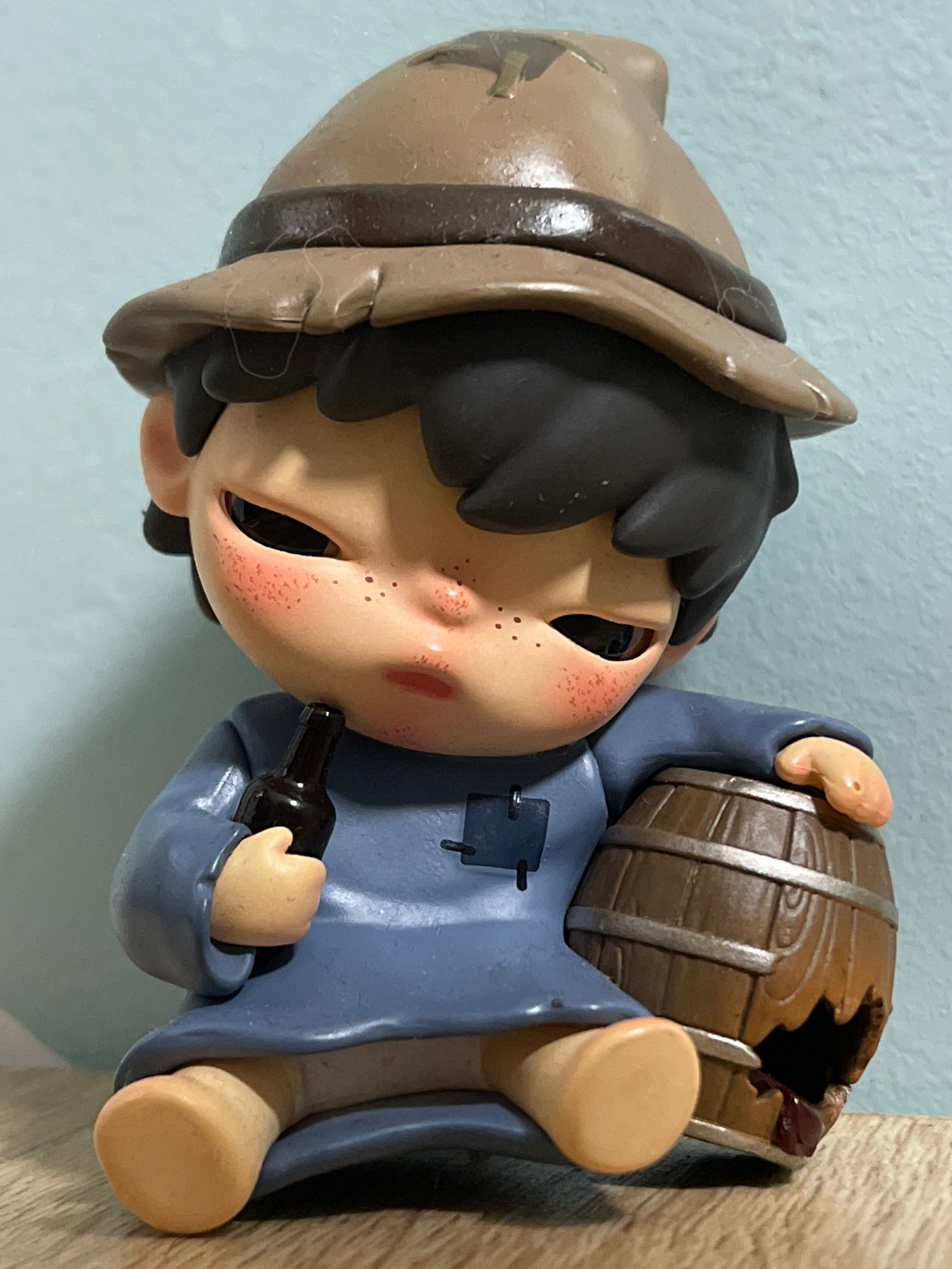 A close-up shot shows a figurine of a man, seemingly drunk, with a brown bottle to his face. He is wearing a blue jacket and a brown hat, and holding a damaged wooden barrel. The background is a plainβ¦read more