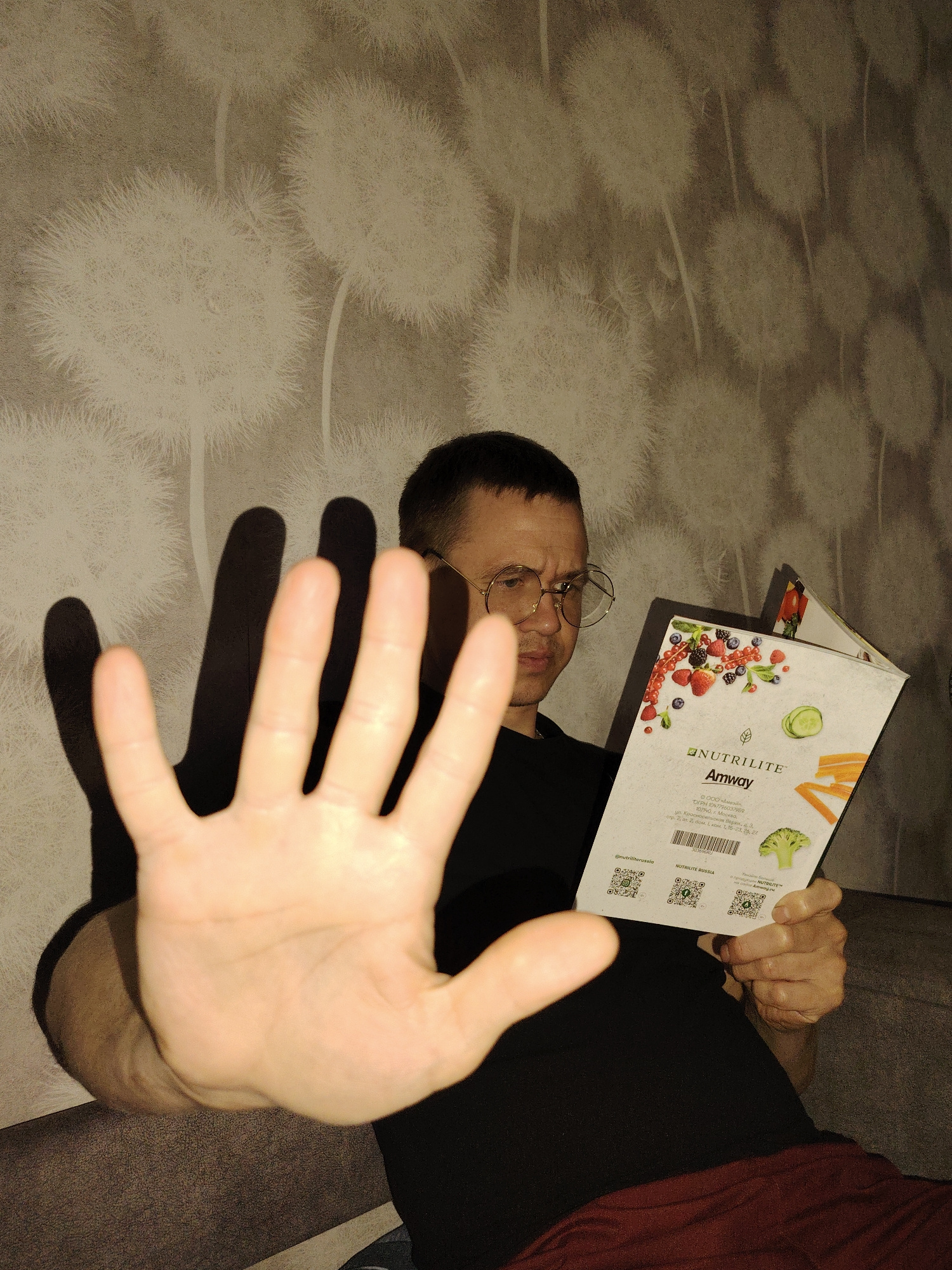 A person with short, dark hair and round, wire-frame glasses is seated and holding up their left hand, palm forward, in a stop gesture. The person is wearing a black shirt and red pants. They are hold…read more